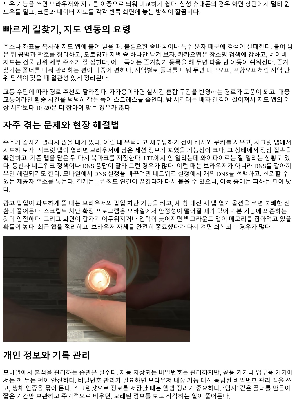 도우기능을쓰면브라우저와지도를이중으로띄워비교하기쉽다. 삼성휴대폰의경우화면상단에서멀티윈 도우를열고, 크롬과네이버지도를각각반쪽화면에놓는방식이깔끔하다. 빠르게길찾기, 지도연동의요령 주소나좌표를복사해지도앱에붙여넣을때, 불필요한줄바꿈이나특수문자때문에검색이실패한다. 붙여넣 은뒤공백과괄호를정리하고, 도로명과지번중하나만남겨보자. 카카오맵은장소명검색에강하고, 네이버 지도는건물단위세부주소가잘잡힌다. 어느쪽이든즐겨찾기등록을해두면다음번이동이쉬워진다. 즐겨 찾기는폴더를나눠관리하는편이나중에편하다. 지역별로폴더를나눠두면대구오피, 포항오피처럼지역단 위탐색이잦을때일관성있게정리된다. 교통수단에따라경로추천도달라진다. 자가용이라면실시간혼잡구간을반영하는경로가도움이되고, 대중 교통이라면환승시간을넉넉히잡는쪽이스트레스를줄인다. 밤시간대는배차간격이길어져서지도앱의예 상시간보다 10~20분더잡아야맞는경우가많다. 자주겪는문제와현장해결법 주소가갑자기열리지않을때가있다. 이럴때무턱대고재부팅하기전에캐시와쿠키를지우고, 시크릿탭에서 시도해보자. 시크릿탭이열리면브라우저에남은세션정보가꼬였을가능성이크다. 그상태에서정상접속을 확인하고, 기존탭을닫은뒤다시북마크를저장한다. LTE에서안열리는데와이파이로는잘열리는상황도있 다. 통신사네트워크정책이나 DNS 응답이달라그런경우가많다. 이런때는브라우저가아니라 DNS를갈아끼 우면해결되기도한다. 모바일에서 DNS 설정을바꾸려면네트워크설정에서개인 DNS를선택하고, 신뢰할수 있는제공자주소를넣는다. 길게는 1분정도연결이끊겼다가다시붙을수있으니, 이동중에는피하는편이낫 다. 광고팝업이과도하게뜰때는브라우저의팝업차단기능을켜고, 새창대신새탭열기옵션을쓰면불쾌한전 환이줄어든다. 스크립트차단확장프로그램은모바일에서안정성이떨어질때가있어기본기능에의존하는 것이안전하다. 그리고화면이갑자기어두워지거나입력이늦어지면백그라운드앱이메모리를잡아먹고있을 확률이높다. 최근앱을정리하고, 브라우저자체를완전히종료했다가다시켜면회복되는경우가많다. 개인정보와기록관리 모바일에서흔적을관리하는습관은필수다. 자동저장되는비밀번호는편리하지만, 공용기기나업무용기기에 서는꺼두는편이안전하다. 비밀번호관리가필요하면브라우저내장기능대신독립된비밀번호관리앱을쓰 고, 생체인증을묶어둔다. 스크린샷으로정보를저장할때는앨범정리가중요하다. ‘임시’ 같은폴더를만들어 짧은기간만보관하고주기적으로비우면, 오래된정보를보고착각하는일이줄어든다.