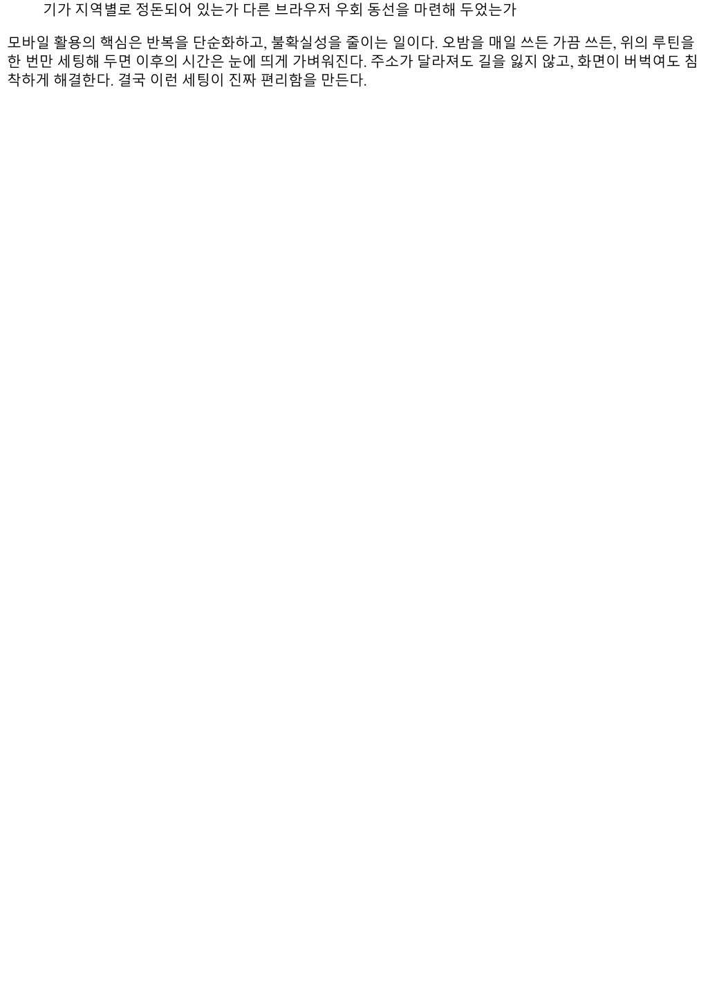 기가지역별로정돈되어있는가다른브라우저우회동선을마련해두었는가기가지역별로정돈되어있는가다른브라우저우회동선을마련해두었는가 모바일활용의핵심은반복을단순화하고, 불확실성을줄이는일이다. 오밤을매일쓰든가끔쓰든, 위의루틴을 한번만세팅해두면이후의시간은눈에띄게가벼워진다. 주소가달라져도길을잃지않고, 화면이버벅여도침 착하게해결한다. 결국이런세팅이진짜편리함을만든다.