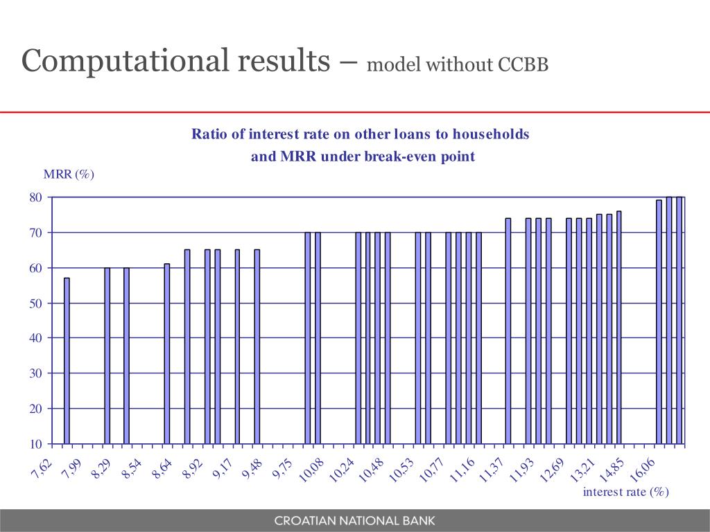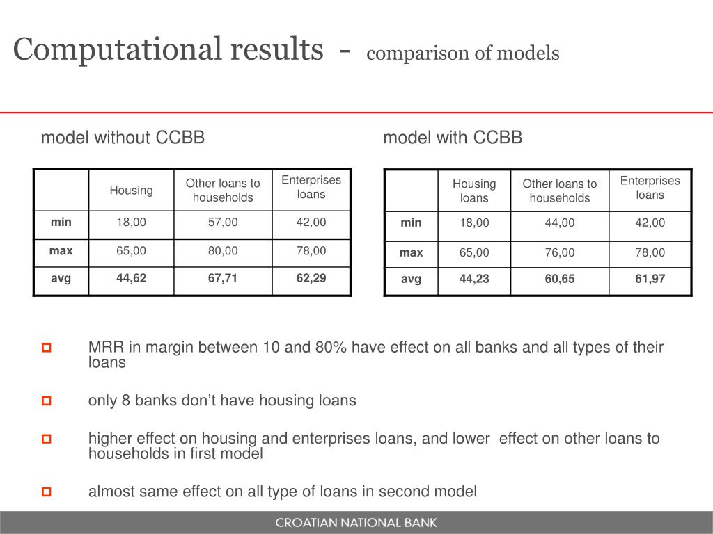 Computational results - comparisonof models • MRR in margin between 10 and 80% have effect on all banks and all types of their loans • only 8 banks don’t have housing loans • higher effect on housing and enterprises loans, and lower effect on other loans to households in first model • almost same effect on all type of loans in second model model without CCBB model with CCBB