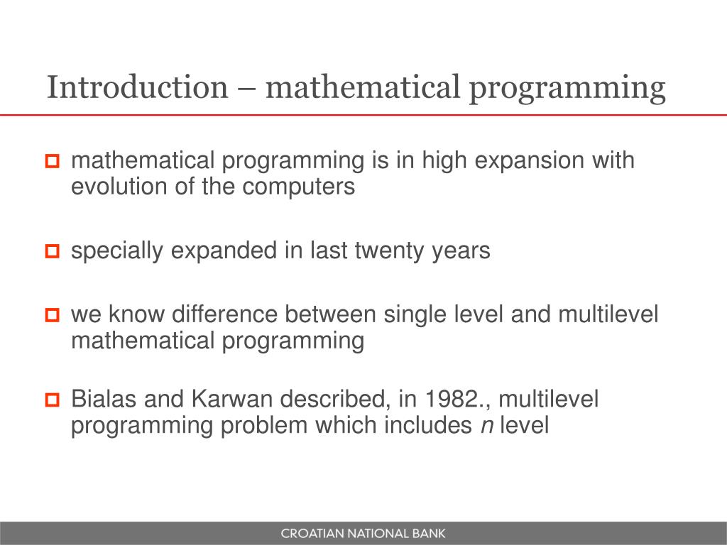 Introduction – mathematical programming • mathematical programming is in high expansion with evolution of the computers • specially expanded in last twenty years • we know difference between single level and multilevel mathematical programming • Bialas and Karwan described, in 1982., multilevel programming problem which includesn level