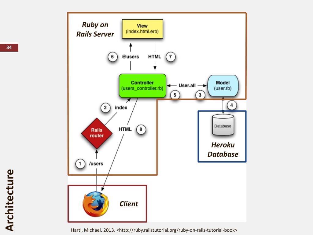 Ruby on Rails Server Architecture Heroku Database Client Hartl, Michael. 2013. <http://ruby.railstutorial.org/ruby-on-rails-tutorial-book>