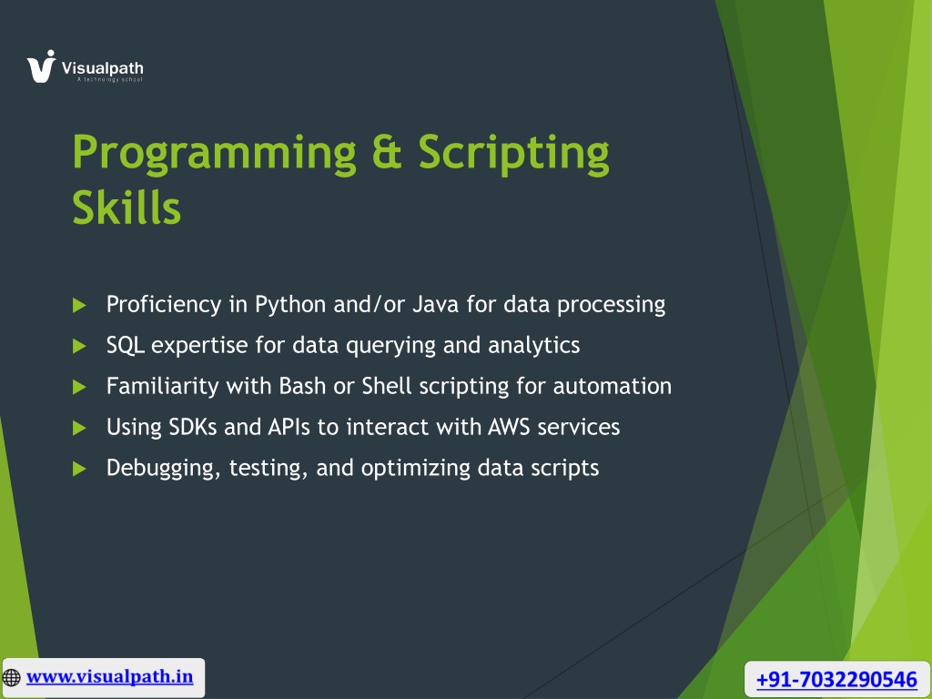 5. Programming & Scripting Skills • Proficiency in Python and/or Java for data processing • SQL expertise for data querying and analytics • Familiarity with Bash or Shell scripting for automation • Using SDKs and APIs to interact with AWS services • Debugging, testing, and optimizing data scripts