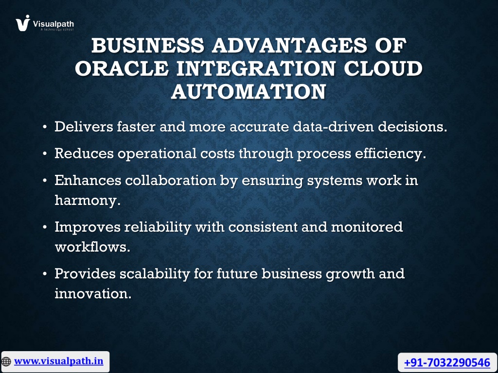 Business Advantages of Oracle Integration Cloud Automation • Delivers faster and more accurate data-driven decisions. • Reduces operational costs through process efficiency. • Enhances collaboration by ensuring systems work in harmony. • Improves reliability with consistent and monitored workflows. • Provides scalability for future business growth and innovation.