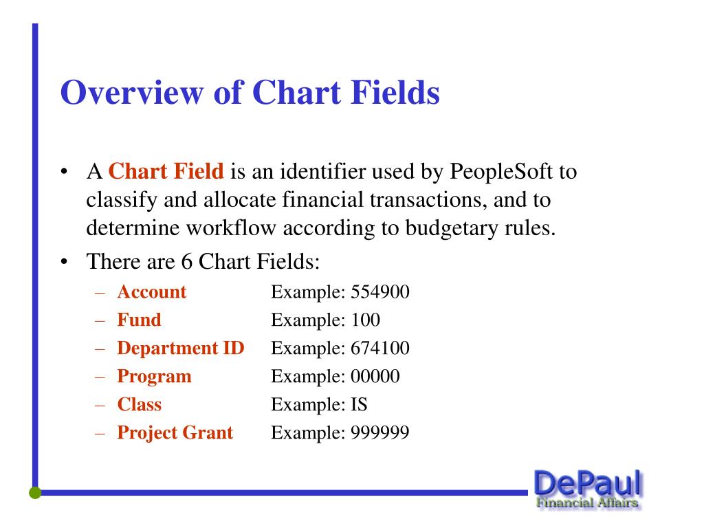 Overview of Chart Fields • A Chart Field is an identifier used by PeopleSoft to classify and allocate financial transactions, and to determine workflow according to budgetary rules. • There are 6 Chart Fields: • Account Example: 554900 • Fund Example: 100 • Department ID Example: 674100 • Program Example: 00000 • Class Example: IS • Project Grant Example: 999999