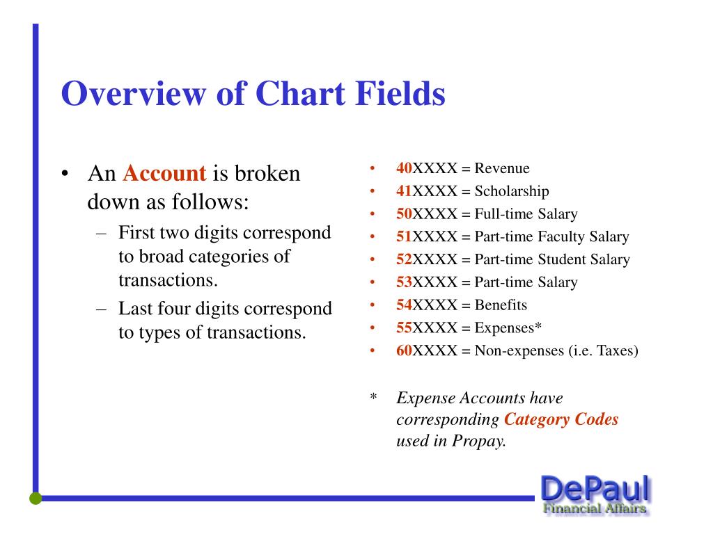 An Account is broken down as follows: First two digits correspond to broad categories of transactions. Last four digits correspond to types of transactions. 40XXXX = Revenue 41XXXX = Scholarship 50XXXX = Full-time Salary 51XXXX = Part-time Faculty Salary 52XXXX = Part-time Student Salary 53XXXX = Part-time Salary 54XXXX = Benefits 55XXXX = Expenses* 60XXXX = Non-expenses (i.e. Taxes) * Expense Accounts have corresponding Category Codesused in Propay. Overview of Chart Fields