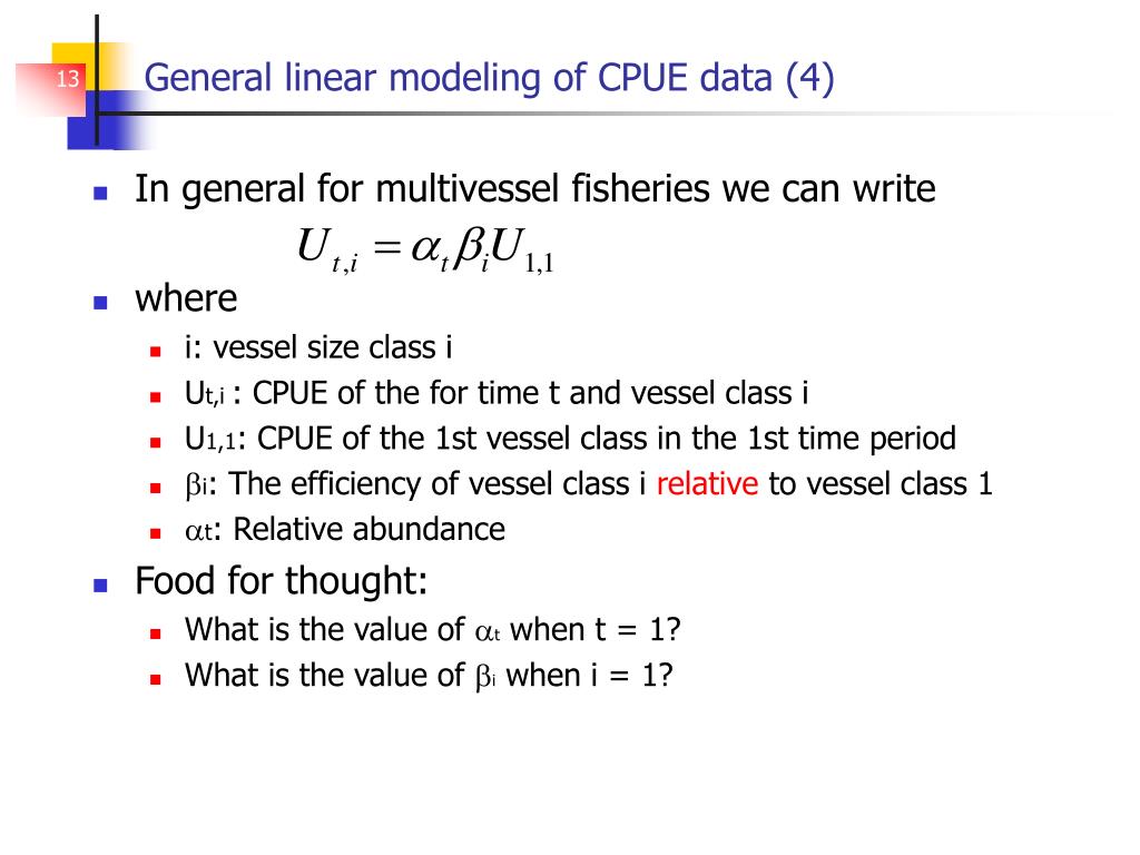General linear modeling of CPUE data (4) • In general for multivessel fisheries we can write • where • i: vessel size class i • Ut,i : CPUE of the for time t and vessel class i • U1,1: CPUE of the 1st vessel class in the 1st time period • bi: The efficiency of vessel class i relative to vessel class 1 • at: Relative abundance • Food for thought: • What is the value of at when t = 1? • What is the value of bi when i = 1?