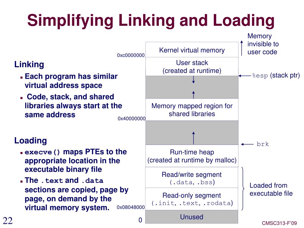 Simplifying Linking and Loading Memory invisible to user code Linking • Each program has similar virtual address space • Code, stack, and shared libraries always start at the same address Loading • execve() maps PTEs to the appropriate location in the executable binary file • The .text and .data sections are copied, page by page, on demand by the virtual memory system. Kernel virtual memory 0xc0000000 User stack (created at runtime) %esp (stack ptr) Memory mapped region for shared libraries 0x40000000 brk Run-time heap (created at runtime by malloc) Read/write segment (.data, .bss) Loaded from executable file Read-only segment (.init, .text, .rodata) 0x08048000 Unused 0