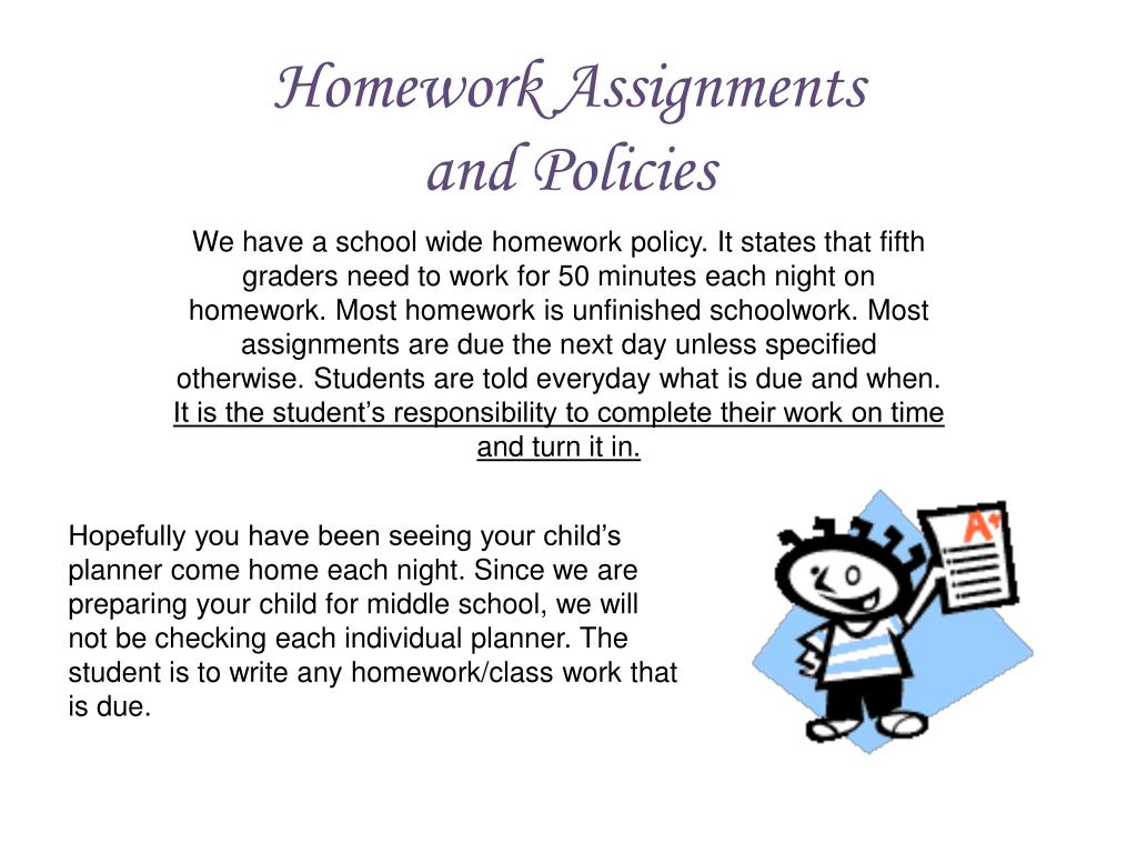 Homework Assignments and Policies We have a school wide homework policy. It states that fifth graders need to work for 50 minutes each night on homework. Most homework is unfinished schoolwork. Most assignments are due the next day unless specified otherwise. Students are told everyday what is due and when. It is the student’s responsibility to complete their work on time and turn it in. Hopefully you have been seeing your child’s planner come home each night. Since we are preparing your child for middle school, we will not be checking each individual planner. The student is to write any homework/class work that is due.