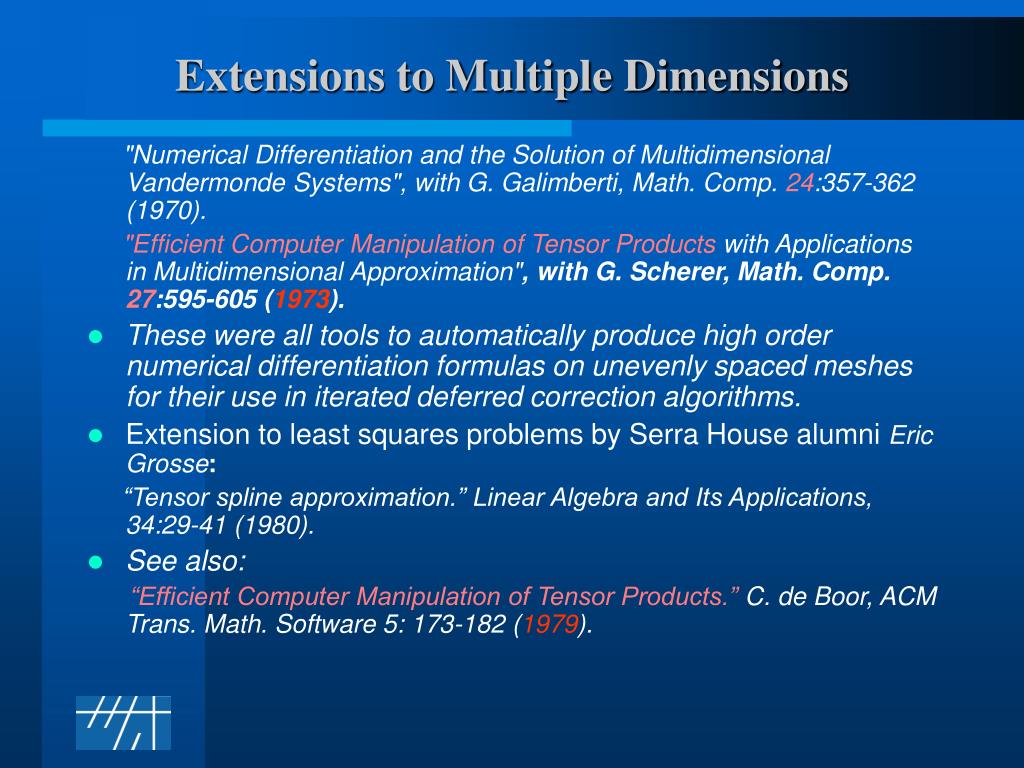 Extensions to Multiple Dimensions "Numerical Differentiation and the Solution of Multidimensional Vandermonde Systems", with G. Galimberti, Math. Comp. 24:357-362 (1970). "Efficient Computer Manipulation of Tensor Products with Applications in Multidimensional Approximation", with G. Scherer, Math. Comp. 27:595-605 (1973). • These were all tools to automatically produce high order numerical differentiation formulas on unevenly spaced meshes for their use in iterated deferred correction algorithms. • Extension to least squares problems by Serra House alumniEric Grosse: “Tensor spline approximation.” Linear Algebra and Its Applications, 34:29-41 (1980). • See also: “Efficient Computer Manipulation of Tensor Products.” C. de Boor, ACM Trans. Math. Software 5: 173-182 (1979).