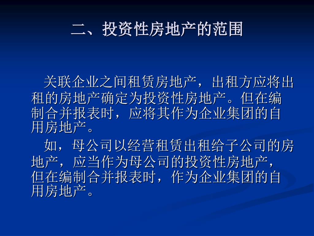 二、投资性房地产的范围 关联企业之间租赁房地产,出租方应将出租的房地产确定为投资性房地产。但在编制合并报表时,应将其作为企业集团的自用房地产。 如,母公司以经营租赁出租给子公司的房地产,应当作为母公司的投资性房地产,但在编制合并报表时,作为企业集团的自用房地产。
