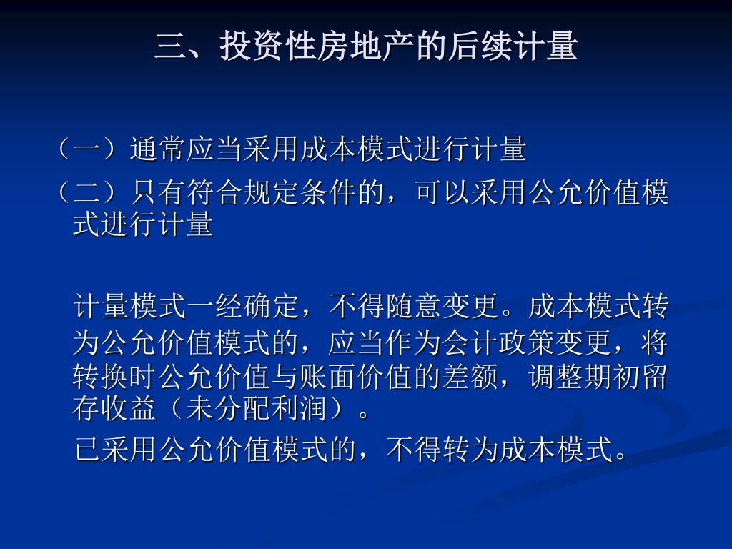 三、投资性房地产的后续计量 (一)通常应当采用成本模式进行计量 (二)只有符合规定条件的,可以采用公允价值模式进行计量 计量模式一经确定,不得随意变更。成本模式转为公允价值模式的,应当作为会计政策变更,将转换时公允价值与账面价值的差额,调整期初留存收益(未分配利润)。 已采用公允价值模式的,不得转为成本模式。