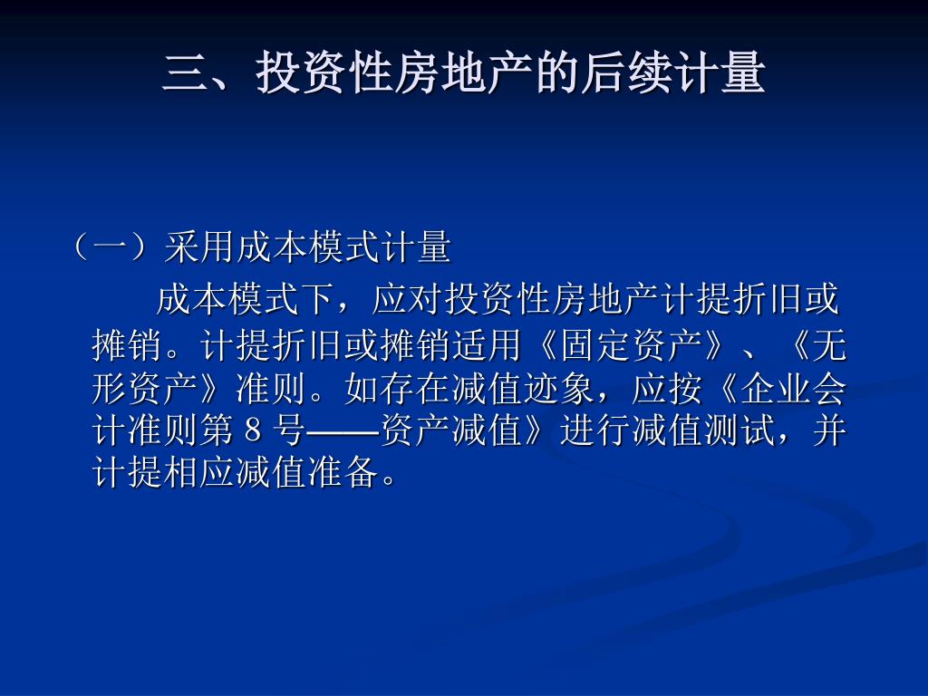 三、投资性房地产的后续计量 (一)采用成本模式计量 成本模式下,应对投资性房地产计提折旧或摊销。计提折旧或摊销适用《固定资产》、《无形资产》准则。如存在减值迹象,应按《企业会计准则第8号——资产减值》进行减值测试,并计提相应减值准备。