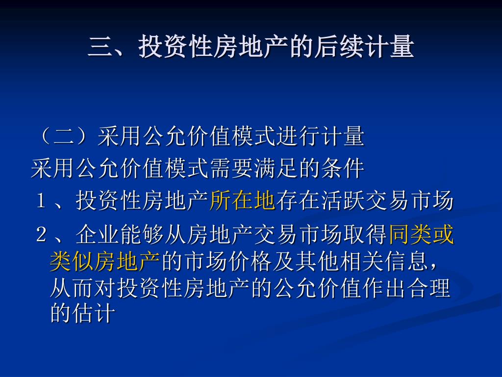 三、投资性房地产的后续计量 (二)采用公允价值模式进行计量 采用公允价值模式需要满足的条件 1、投资性房地产所在地存在活跃交易市场 2、企业能够从房地产交易市场取得同类或类似房地产的市场价格及其他相关信息,从而对投资性房地产的公允价值作出合理的估计