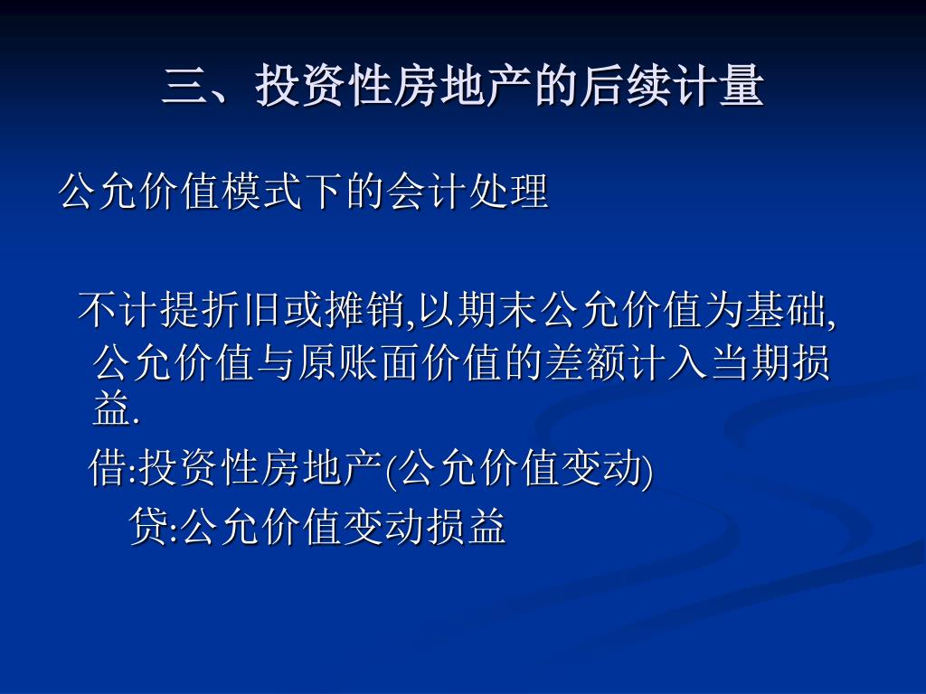 三、投资性房地产的后续计量 公允价值模式下的会计处理 不计提折旧或摊销,以期末公允价值为基础,公允价值与原账面价值的差额计入当期损益. 借:投资性房地产(公允价值变动) 贷:公允价值变动损益