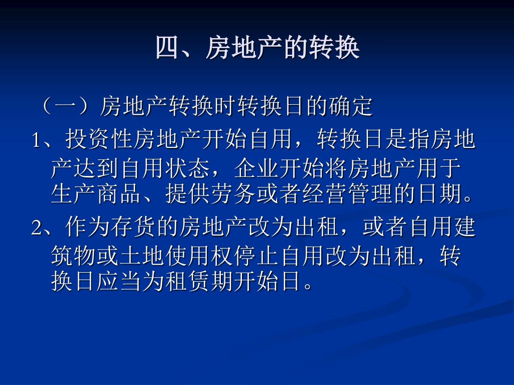 四、房地产的转换 (一)房地产转换时转换日的确定 1、投资性房地产开始自用,转换日是指房地产达到自用状态,企业开始将房地产用于生产商品、提供劳务或者经营管理的日期。 2、作为存货的房地产改为出租,或者自用建筑物或土地使用权停止自用改为出租,转换日应当为租赁期开始日。