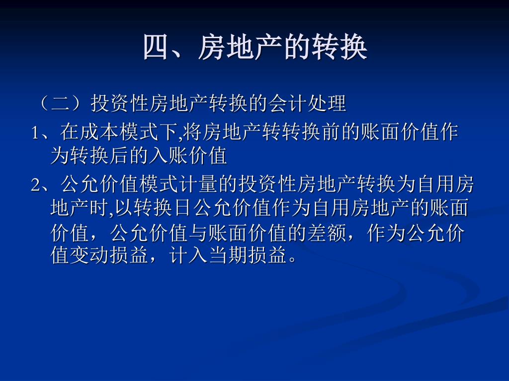 四、房地产的转换 (二)投资性房地产转换的会计处理 1、在成本模式下,将房地产转转换前的账面价值作为转换后的入账价值 2、公允价值模式计量的投资性房地产转换为自用房地产时,以转换日公允价值作为自用房地产的账面价值,公允价值与账面价值的差额,作为公允价值变动损益,计入当期损益。