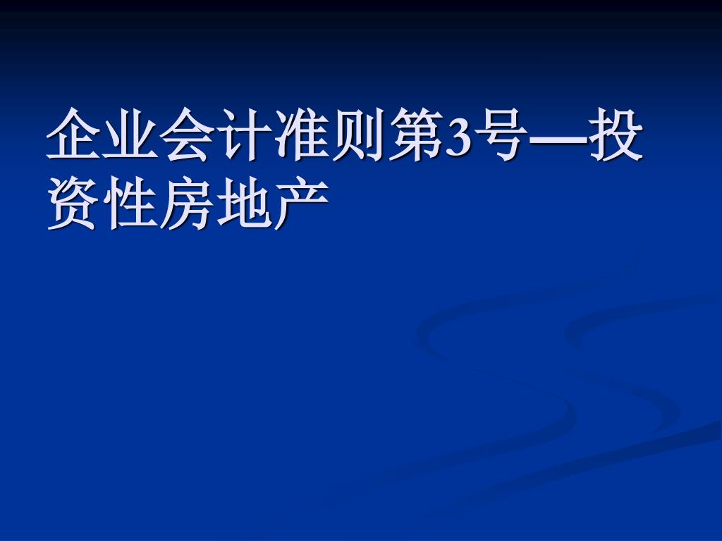 投资性房地产 财 政 部 会 计 司 注册会计师处 刘光忠. 企业会计准则第 3 号 — 投资性房地产. 一、本准则的适用范围 二、投资性房地产的范围 三、投资性房地产的后续计量 四、房地产的转换. 讲解提纲. 一、本准则的适用范围. 适用于投资性房地产的确认、计量和相关信息的披露。 下列各项,适用其他相关准则: 自用房地产,适用 《 固定资产 》 、 《 无形资产 》 作为存货的房地产,适用 《 存货 》 ,销售收入适用 《 收入 》 企业代建的房地产,收入和费用的确认和计量适用 《 建造合同 》