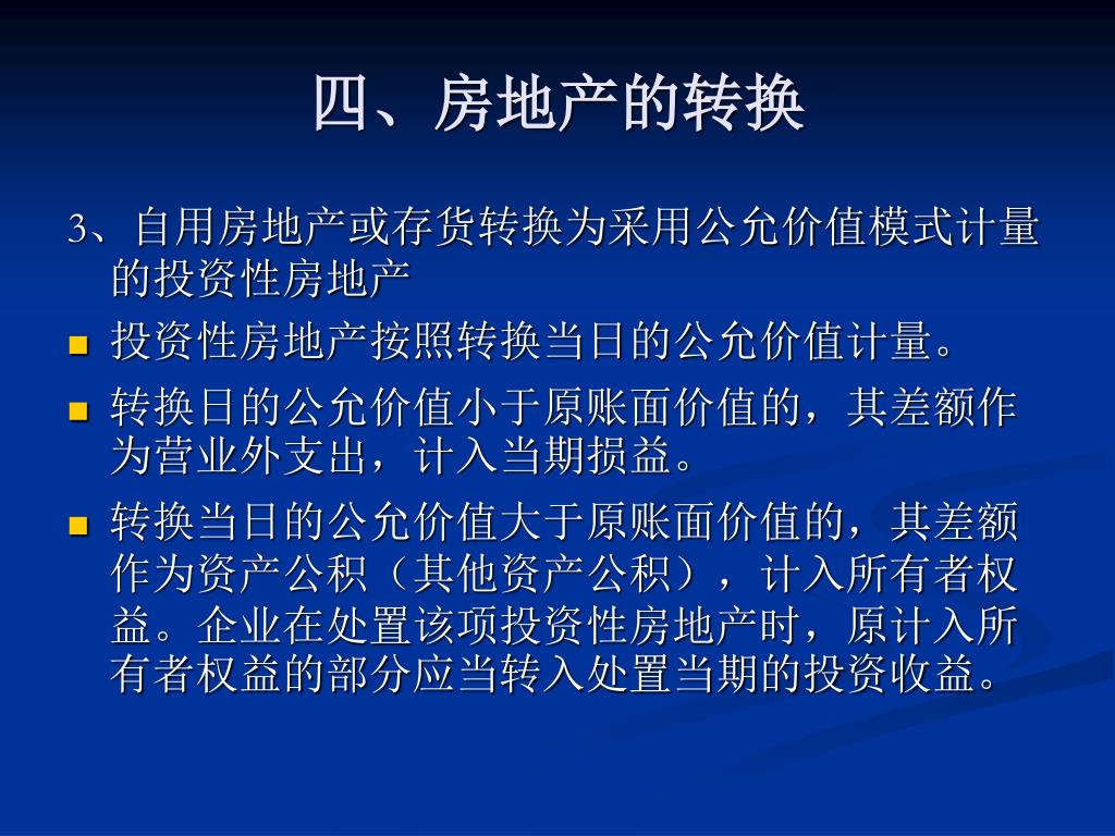 四、房地产的转换 3、自用房地产或存货转换为采用公允价值模式计量的投资性房地产 • 投资性房地产按照转换当日的公允价值计量。 • 转换日的公允价值小于原账面价值的,其差额作为营业外支出,计入当期损益。 • 转换当日的公允价值大于原账面价值的,其差额作为资产公积(其他资产公积),计入所有者权益。企业在处置该项投资性房地产时,原计入所有者权益的部分应当转入处置当期的投资收益。