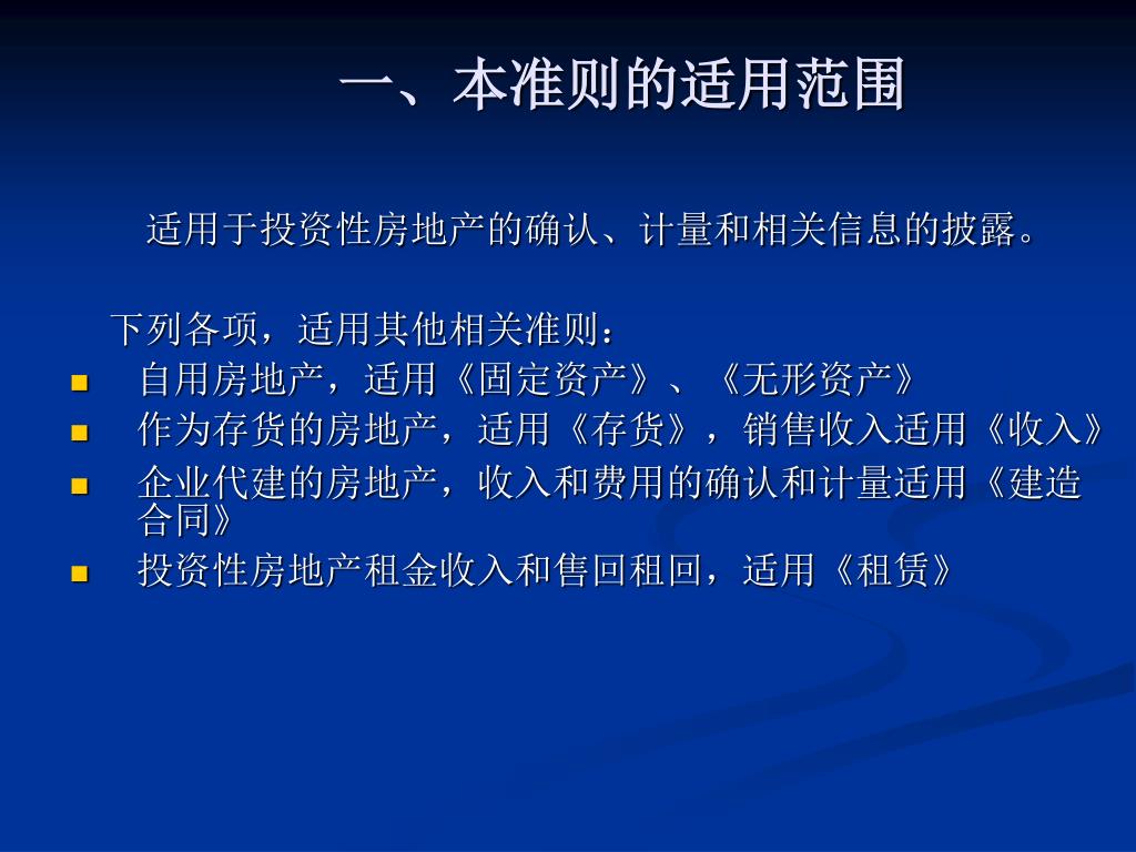 一、本准则的适用范围 适用于投资性房地产的确认、计量和相关信息的披露。 下列各项,适用其他相关准则: • 自用房地产,适用《固定资产》、《无形资产》 • 作为存货的房地产,适用《存货》,销售收入适用《收入》 • 企业代建的房地产,收入和费用的确认和计量适用《建造合同》 • 投资性房地产租金收入和售回租回,适用《租赁》