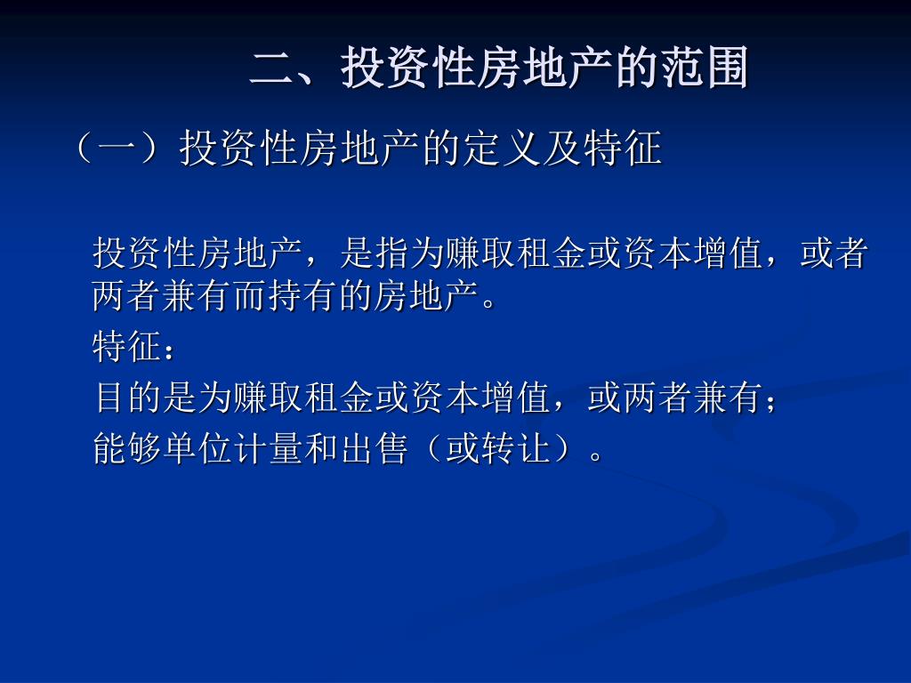 二、投资性房地产的范围 (一)投资性房地产的定义及特征 投资性房地产,是指为赚取租金或资本增值,或者两者兼有而持有的房地产。 特征: 目的是为赚取租金或资本增值,或两者兼有; 能够单位计量和出售(或转让)。