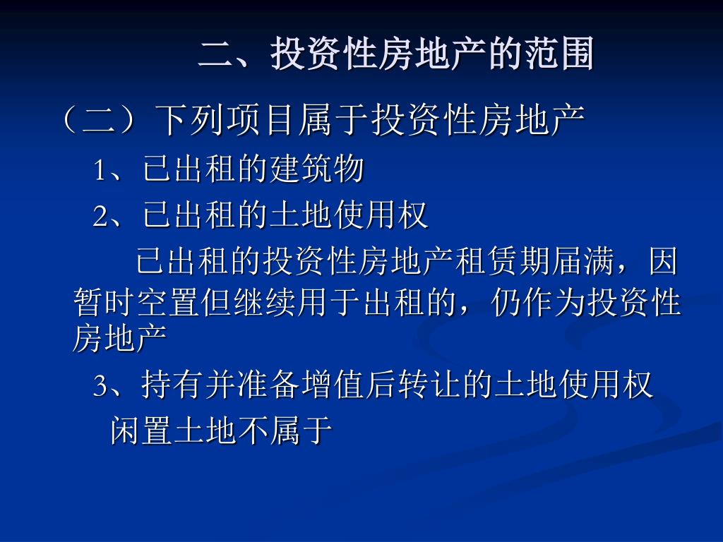 二、投资性房地产的范围 (二)下列项目属于投资性房地产 1、已出租的建筑物 2、已出租的土地使用权 已出租的投资性房地产租赁期届满,因暂时空置但继续用于出租的,仍作为投资性房地产 3、持有并准备增值后转让的土地使用权 闲置土地不属于