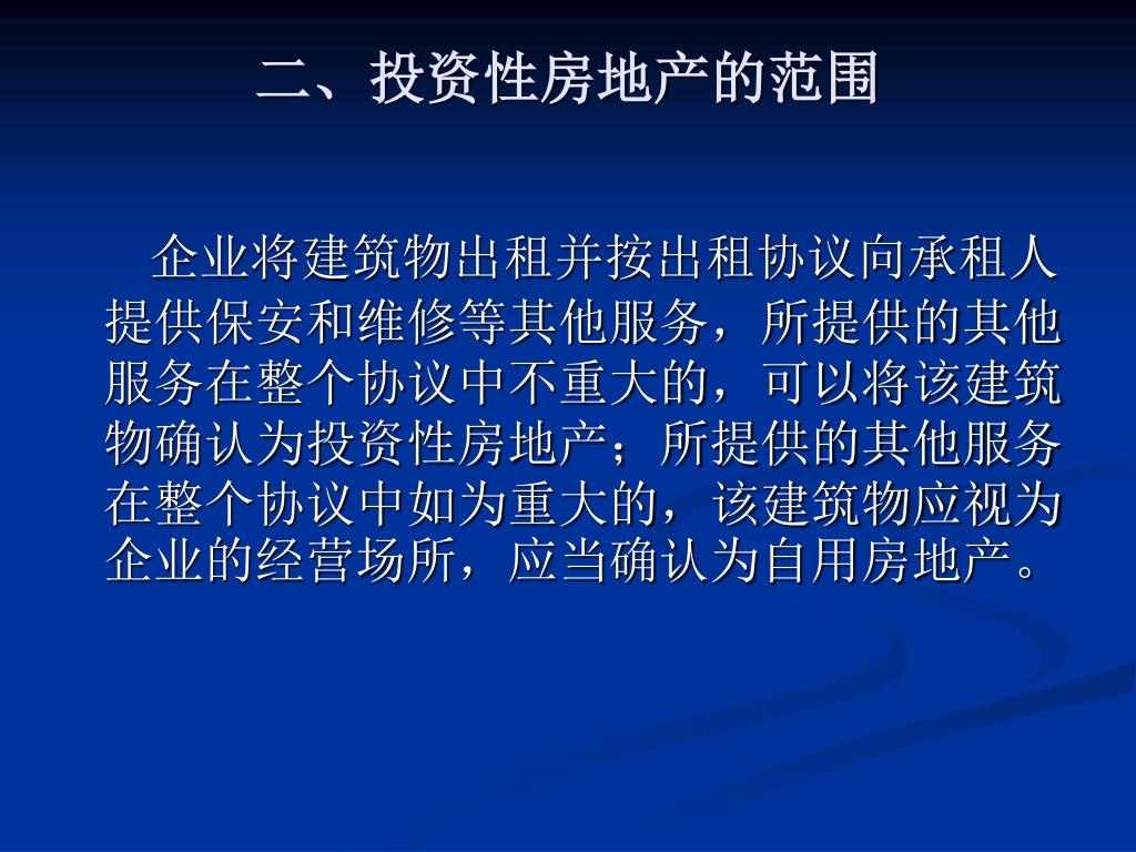 二、投资性房地产的范围 企业将建筑物出租并按出租协议向承租人提供保安和维修等其他服务,所提供的其他服务在整个协议中不重大的,可以将该建筑物确认为投资性房地产;所提供的其他服务在整个协议中如为重大的,该建筑物应视为企业的经营场所,应当确认为自用房地产。