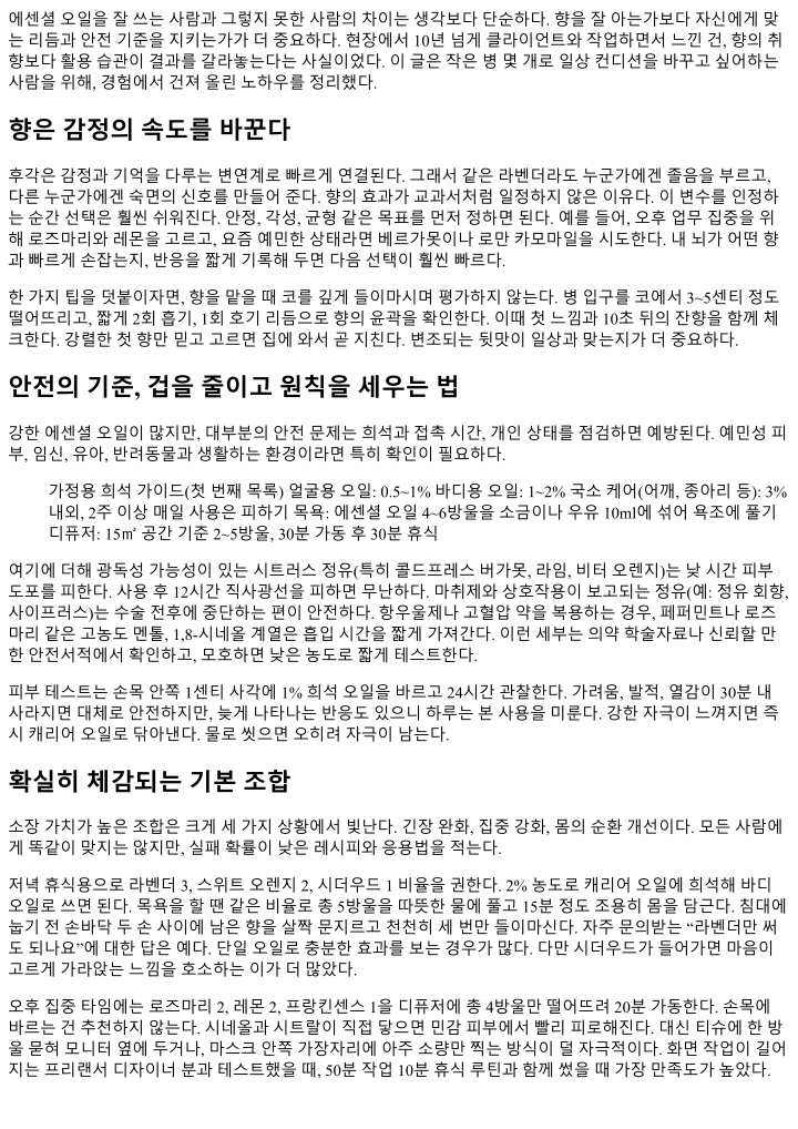 에센셜오일을잘쓰는사람과그렇지못한사람의차이는생각보다단순하다. 향을잘아는가보다자신에게맞 는리듬과안전기준을지키는가가더중요하다. 현장에서 10년넘게클라이언트와작업하면서느낀건, 향의취 향보다활용습관이결과를갈라놓는다는사실이었다. 이글은작은병몇개로일상컨디션을바꾸고싶어하는 사람을위해, 경험에서건져올린노하우를정리했다. 향은감정의속도를바꾼다 후각은감정과기억을다루는변연계로빠르게연결된다. 그래서같은라벤더라도누군가에겐졸음을부르고, 다른누군가에겐숙면의신호를만들어준다. 향의효과가교과서처럼일정하지않은이유다. 이변수를인정하 는순간선택은훨씬쉬워진다. 안정, 각성, 균형같은목표를먼저정하면된다. 예를들어, 오후업무집중을위 해로즈마리와레몬을고르고, 요즘예민한상태라면베르가못이나로만카모마일을시도한다. 내뇌가어떤향 과빠르게손잡는지, 반응을짧게기록해두면다음선택이훨씬빠르다. 한가지팁을덧붙이자면, 향을맡을때코를깊게들이마시며평가하지않는다. 병입구를코에서 3~5센티정도 떨어뜨리고, 짧게 2회흡기, 1회호기리듬으로향의윤곽을확인한다. 이때첫느낌과 10초뒤의잔향을함께체 크한다. 강렬한첫향만믿고고르면집에와서곧지친다. 변조되는뒷맛이일상과맞는지가더중요하다. 안전의기준, 겁을줄이고원칙을세우는법 강한에센셜오일이많지만, 대부분의안전문제는희석과접촉시간, 개인상태를점검하면예방된다. 예민성피 부, 임신, 유아, 반려동물과생활하는환경이라면특히확인이필요하다. 가정용희석가이드(첫번째목록) 얼굴용오일: 0.5~1% 바디용오일: 1~2% 국소케어(어깨, 종아리등): 3% 내외, 2주이상매일사용은피하기목욕: 에센셜오일 4~6방울을소금이나우유 10ml에섞어욕조에풀기 디퓨저: 15㎡공간기준 2~5방울, 30분가동후 30분휴식 여기에더해광독성가능성이있는시트러스정유(특히콜드프레스버가못, 라임, 비터오렌지)는낮시간피부 도포를피한다. 사용후 12시간직사광선을피하면무난하다. 마취제와상호작용이보고되는정유(예: 정유회향, 사이프러스)는수술전후에중단하는편이안전하다. 항우울제나고혈압약을복용하는경우, 페퍼민트나로즈 마리같은고농도멘톨, 1,8-시네올계열은흡입시간을짧게가져간다. 이런세부는의약학술자료나신뢰할만 한안전서적에서확인하고, 모호하면낮은농도로짧게테스트한다. 피부테스트는손목안쪽 1센티사각에 1% 희석오일을바르고 24시간관찰한다. 가려움, 발적, 열감이 30분내 사라지면대체로안전하지만, 늦게나타나는반응도있으니하루는본사용을미룬다. 강한자극이느껴지면즉 시캐리어오일로닦아낸다. 물로씻으면오히려자극이남는다. 확실히체감되는기본조합 소장가치가높은조합은크게세가지상황에서빛난다. 긴장완화, 집중강화, 몸의순환개선이다. 모든사람에 게똑같이맞지는않지만, 실패확률이낮은레시피와응용법을적는다. 저녁휴식용으로라벤더 3, 스위트오렌지 2, 시더우드 1 비율을권한다. 2% 농도로캐리어오일에희석해바디 오일로쓰면된다. 목욕을할땐같은비율로총 5방울을따뜻한물에풀고 15분정도조용히몸을담근다. 침대에 눕기전손바닥두손사이에남은향을살짝문지르고천천히세번만들이마신다. 자주문의받는 “라벤더만써 도되나요”에대한답은예다. 단일오일로충분한효과를보는경우가많다. 다만시더우드가들어가면마음이 고르게가라앉는느낌을호소하는이가더많았다. 오후집중타임에는로즈마리 2, 레몬 2, 프랑킨센스 1을디퓨저에총 4방울만떨어뜨려 20분가동한다. 손목에 바르는건추천하지않는다. 시네올과시트랄이직접닿으면민감피부에서빨리피로해진다. 대신티슈에한방 울묻혀모니터옆에두거나, 마스크안쪽가장자리에아주소량만찍는방식이덜자극적이다. 화면작업이길어 지는프리랜서디자이너분과테스트했을때, 50분작업 10분휴식루틴과함께썼을때가장만족도가높았다.