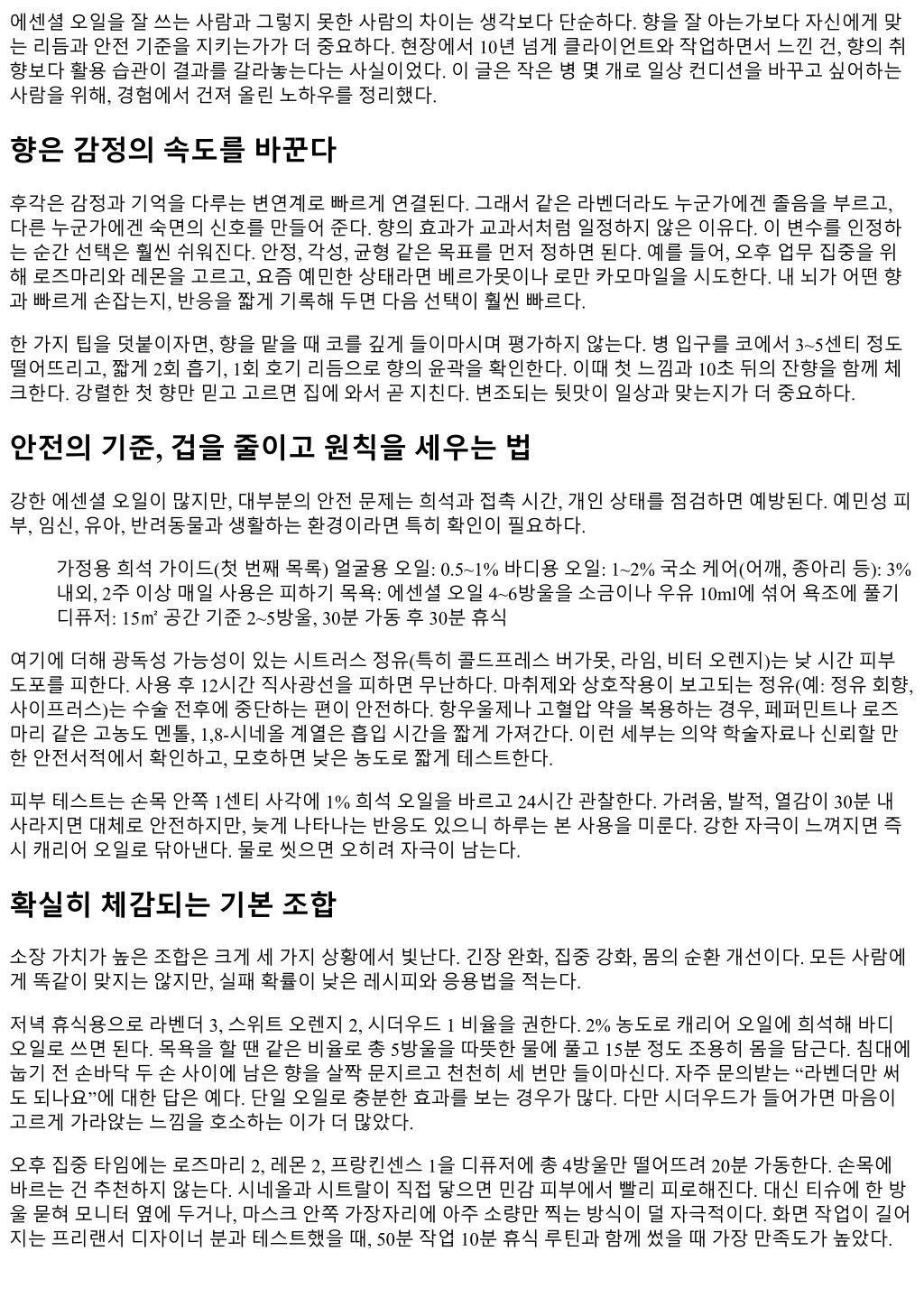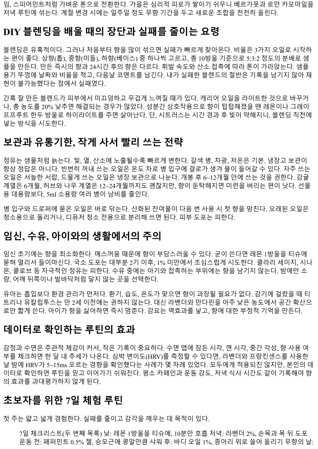 임, 스피어민트처럼가벼운톤으로전환한다. 가을은심리적피로가쌓이기쉬우니베르가못과로만카모마일을 저녁루틴에섞는다. 계절변경시에는일주일정도무향기간을두고새로운조합을천천히올린다. DIY 블렌딩을배울때의장단과실패를줄이는요령 블렌딩은유혹적이다. 그러나처음부터향을많이섞으면실패가빠르게찾아온다. 비율은 3가지오일로시작하 는편이좋다. 상향(톱), 중향(미들), 하향(베이스) 중하나씩고르고, 총 10방울기준으로 5:3:2 정도의분배로샘 플을만든다. 만든즉시의향과 24시간후의향은다르다. 휘발속도와산소접촉에따라톤이가라앉는다. 샘플 용기뚜껑에날짜와비율을적고, 다음날코멘트를남긴다. 내가실패한블렌드의절반은기록을남기지않아재 현이불가능했다는점에서실패였다. 간혹잘만든블렌드가피부에서미끄덩하고무겁게느껴질때가있다. 캐리어오일을라이트한것으로바꾸거 나, 총농도를 20% 낮추면해결되는경우가많았다. 성분간상호작용으로향이텁텁해졌을땐레몬이나그레이 프프루트한두방울로하이라이트를주면살아난다. 단, 시트러스는시간경과후빛이약해지니, 블렌딩직전에 넣는방식을시도한다. 보관과유통기한, 작게사서빨리쓰는전략 정유는생물처럼늙는다. 빛, 열, 산소에노출될수록빠르게변한다. 갈색병, 차광, 저온은기본. 냉장고보관이 항상정답은아니다. 빈번히꺼내쓰는오일은온도차로병입구에결로가생겨물이들어갈수있다. 자주쓰는 오일은서늘한서랍, 드물게쓰는오일은냉장보관으로나눈다. 개봉후 6~12개월안에쓰는것을권한다. 감귤 계열은 6개월, 허브와나무계열은 12~24개월까지도괜찮지만, 향이둔탁해지면미련을버리는편이낫다. 선물 용대용량보다, 5ml 소용량여러병이낭비를줄인다. 병입구와드로퍼에묻은오일은바로닦는다. 산화된잔여물이다음번사용시첫향을망친다. 오래된오일은 청소용으로돌리거나, 디퓨저청소전용으로분리해쓰면된다. 피부도포는피한다. 임신, 수유, 아이와의생활에서의주의 임신초기에는향을최소화한다. 메스꺼움때문에향이부담스러울수있다. 굳이쓴다면레몬 1방울을티슈에 묻혀멀리서들이마신다. 국소도포는대부분 2기이후, 1% 미만에서조심스럽게시도한다. 클라리세이지, 시나 몬, 클로브등자극적인정유는피한다. 수유중에는아기와접촉하는부위에는향을남기지않는다. 밤에만소 량, 어깨뒤쪽이나발바닥처럼닿지않는곳을선택한다. 유아는흡입보다환경관리가먼저다. 환기, 습도, 온도가맞으면향이과장될필요가없다. 감기에걸렸을때티 트리나유칼립투스는만 2세이전에는권하지않는다. 대신라벤더와만다린을아주낮은농도에서공간확산으 로만짧게쓴다. 아이가향을싫어하면즉시멈춘다. 강요는역효과를낳고, 향에대한부정적기억을만든다. 데이터로확인하는루틴의효과 감정과수면은주관적체감이커서, 작은기록이중요하다. 수면앱에잠든시각, 깬시각, 중간각성, 향사용여 부를체크하면한달내추세가나온다. 심박변이도(HRV)를측정할수있다면, 라벤더와프랑킨센스를사용한 날밤에 HRV가 5~15ms 오르는경향을확인했다는사례가몇차례있었다. 모두에게적용되진않지만, 본인의데 이터로확인하면루틴을믿고이어가기쉬워진다. 평소카페인과운동강도, 저녁식사시간도같이기록해야향 의효과를과대평가하지않게된다. 초보자를위한 7일체험루틴 첫주는얇고넓게경험한다. 실패를줄이고감각을깨우는데목적이있다. 7일체크리스트(두번째목록) 낮: 레몬 1방울을티슈에, 10분만호흡저녁: 라벤더 2%, 손목과목뒤도포 운동전: 페퍼민트 0.5% 젤, 승모근에콩알만큼샤워후: 바디오일 1%, 종아리위로쓸어올리기무향의날: