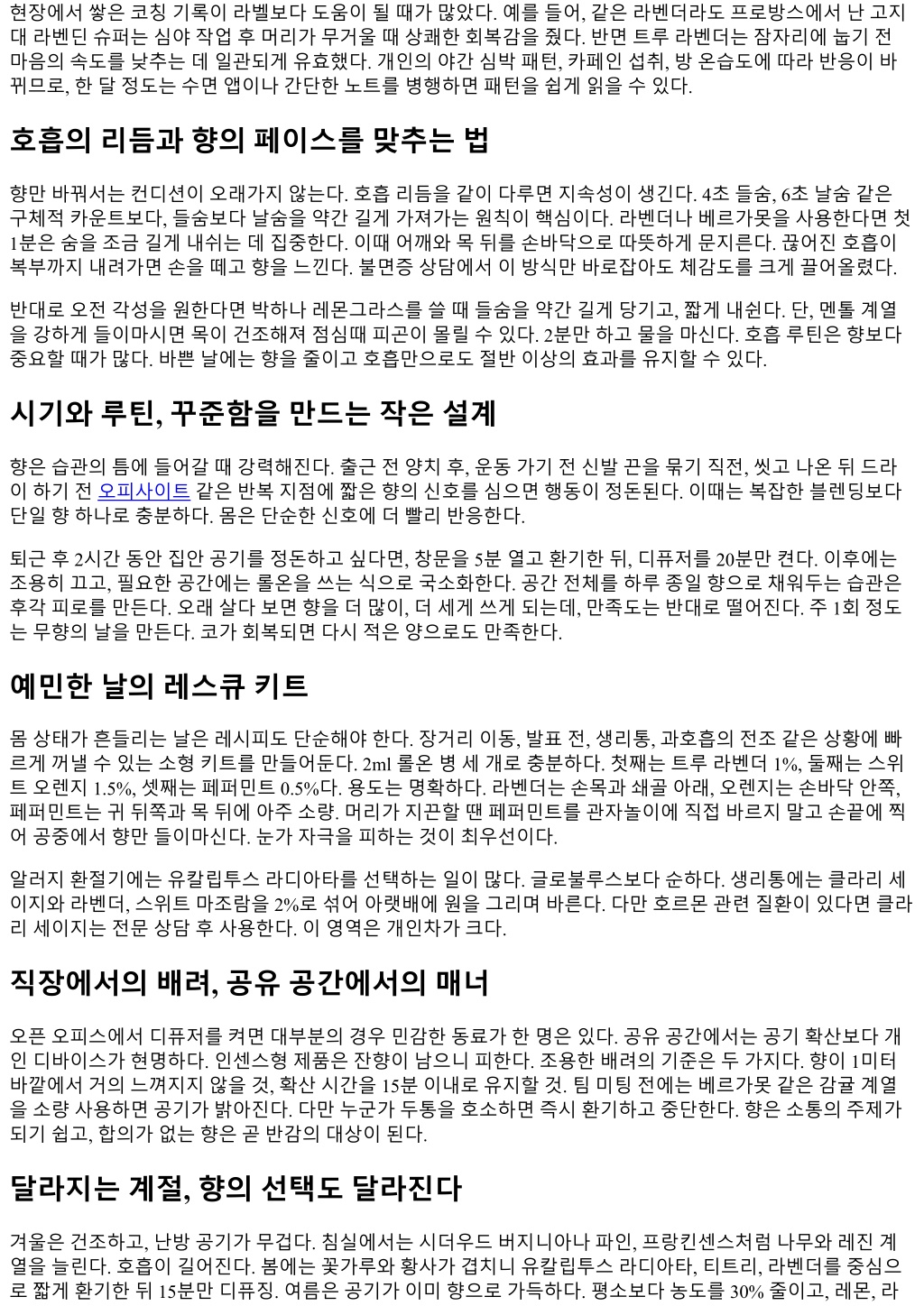현장에서쌓은코칭기록이라벨보다도움이될때가많았다. 예를들어, 같은라벤더라도프로방스에서난고지 대라벤딘슈퍼는심야작업후머리가무거울때상쾌한회복감을줬다. 반면트루라벤더는잠자리에눕기전 마음의속도를낮추는데일관되게유효했다. 개인의야간심박패턴, 카페인섭취, 방온습도에따라반응이바 뀌므로, 한달정도는수면앱이나간단한노트를병행하면패턴을쉽게읽을수있다. 호흡의리듬과향의페이스를맞추는법 향만바꿔서는컨디션이오래가지않는다. 호흡리듬을같이다루면지속성이생긴다. 4초들숨, 6초날숨같은 구체적카운트보다, 들숨보다날숨을약간길게가져가는원칙이핵심이다. 라벤더나베르가못을사용한다면첫 1분은숨을조금길게내쉬는데집중한다. 이때어깨와목뒤를손바닥으로따뜻하게문지른다. 끊어진호흡이 복부까지내려가면손을떼고향을느낀다. 불면증상담에서이방식만바로잡아도체감도를크게끌어올렸다. 반대로오전각성을원한다면박하나레몬그라스를쓸때들숨을약간길게당기고, 짧게내쉰다. 단, 멘톨계열 을강하게들이마시면목이건조해져점심때피곤이몰릴수있다. 2분만하고물을마신다. 호흡루틴은향보다 중요할때가많다. 바쁜날에는향을줄이고호흡만으로도절반이상의효과를유지할수있다. 시기와루틴, 꾸준함을만드는작은설계 향은습관의틈에들어갈때강력해진다. 출근전양치후, 운동가기전신발끈을묶기직전, 씻고나온뒤드라 이하기전오피사이트같은반복지점에짧은향의신호를심으면행동이정돈된다. 이때는복잡한블렌딩보다 단일향하나로충분하다. 몸은단순한신호에더빨리반응한다. 퇴근후 2시간동안집안공기를정돈하고싶다면, 창문을 5분열고환기한뒤, 디퓨저를 20분만켠다. 이후에는 조용히끄고, 필요한공간에는롤온을쓰는식으로국소화한다. 공간전체를하루종일향으로채워두는습관은 후각피로를만든다. 오래살다보면향을더많이, 더세게쓰게되는데, 만족도는반대로떨어진다. 주 1회정도 는무향의날을만든다. 코가회복되면다시적은양으로도만족한다. 예민한날의레스큐키트 몸상태가흔들리는날은레시피도단순해야한다. 장거리이동, 발표전, 생리통, 과호흡의전조같은상황에빠 르게꺼낼수있는소형키트를만들어둔다. 2ml 롤온병세개로충분하다. 첫째는트루라벤더 1%, 둘째는스위 트오렌지 1.5%, 셋째는페퍼민트 0.5%다. 용도는명확하다. 라벤더는손목과쇄골아래, 오렌지는손바닥안쪽, 페퍼민트는귀뒤쪽과목뒤에아주소량. 머리가지끈할땐페퍼민트를관자놀이에직접바르지말고손끝에찍 어공중에서향만들이마신다. 눈가자극을피하는것이최우선이다. 알러지환절기에는유칼립투스라디아타를선택하는일이많다. 글로불루스보다순하다. 생리통에는클라리세 이지와라벤더, 스위트마조람을 2%로섞어아랫배에원을그리며바른다. 다만호르몬관련질환이있다면클라 리세이지는전문상담후사용한다. 이영역은개인차가크다. 직장에서의배려, 공유공간에서의매너 오픈오피스에서디퓨저를켜면대부분의경우민감한동료가한명은있다. 공유공간에서는공기확산보다개 인디바이스가현명하다. 인센스형제품은잔향이남으니피한다. 조용한배려의기준은두가지다. 향이 1미터 바깥에서거의느껴지지않을것, 확산시간을 15분이내로유지할것. 팀미팅전에는베르가못같은감귤계열 을소량사용하면공기가밝아진다. 다만누군가두통을호소하면즉시환기하고중단한다. 향은소통의주제가 되기쉽고, 합의가없는향은곧반감의대상이된다. 달라지는계절, 향의선택도달라진다 겨울은건조하고, 난방공기가무겁다. 침실에서는시더우드버지니아나파인, 프랑킨센스처럼나무와레진계 열을늘린다. 호흡이길어진다. 봄에는꽃가루와황사가겹치니유칼립투스라디아타, 티트리, 라벤더를중심으 로짧게환기한뒤 15분만디퓨징. 여름은공기가이미향으로가득하다. 평소보다농도를 30% 줄이고, 레몬, 라