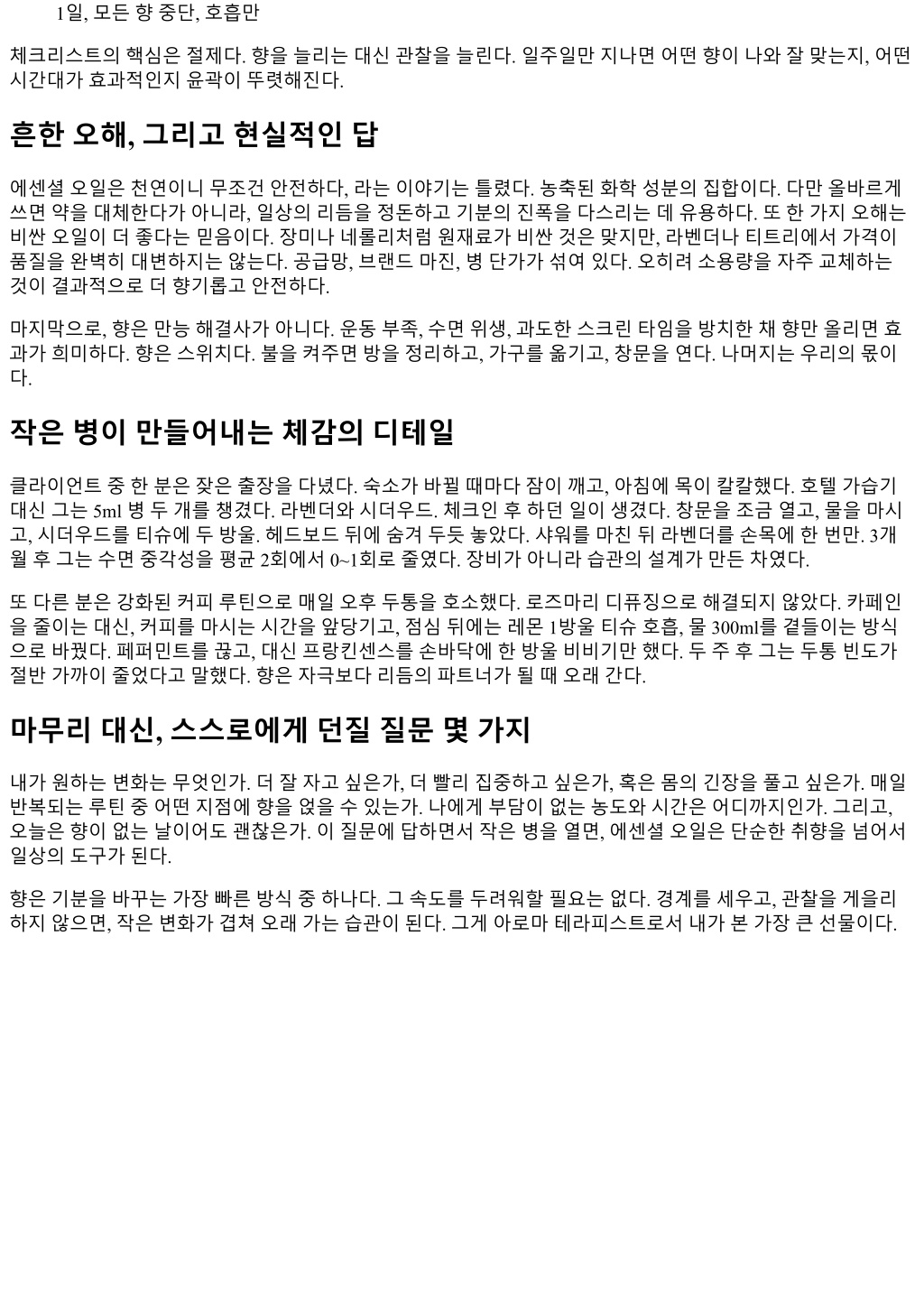 1일, 모든향중단, 호흡만 체크리스트의핵심은절제다. 향을늘리는대신관찰을늘린다. 일주일만지나면어떤향이나와잘맞는지, 어떤 시간대가효과적인지윤곽이뚜렷해진다. 흔한오해, 그리고현실적인답 에센셜오일은천연이니무조건안전하다, 라는이야기는틀렸다. 농축된화학성분의집합이다. 다만올바르게 쓰면약을대체한다가아니라, 일상의리듬을정돈하고기분의진폭을다스리는데유용하다. 또한가지오해는 비싼오일이더좋다는믿음이다. 장미나네롤리처럼원재료가비싼것은맞지만, 라벤더나티트리에서가격이 품질을완벽히대변하지는않는다. 공급망, 브랜드마진, 병단가가섞여있다. 오히려소용량을자주교체하는 것이결과적으로더향기롭고안전하다. 마지막으로, 향은만능해결사가아니다. 운동부족, 수면위생, 과도한스크린타임을방치한채향만올리면효 과가희미하다. 향은스위치다. 불을켜주면방을정리하고, 가구를옮기고, 창문을연다. 나머지는우리의몫이 다. 작은병이만들어내는체감의디테일 클라이언트중한분은잦은출장을다녔다. 숙소가바뀔때마다잠이깨고, 아침에목이칼칼했다. 호텔가습기 대신그는 5ml 병두개를챙겼다. 라벤더와시더우드. 체크인후하던일이생겼다. 창문을조금열고, 물을마시 고, 시더우드를티슈에두방울. 헤드보드뒤에숨겨두듯놓았다. 샤워를마친뒤라벤더를손목에한번만. 3개 월후그는수면중각성을평균 2회에서 0~1회로줄였다. 장비가아니라습관의설계가만든차였다. 또다른분은강화된커피루틴으로매일오후두통을호소했다. 로즈마리디퓨징으로해결되지않았다. 카페인 을줄이는대신, 커피를마시는시간을앞당기고, 점심뒤에는레몬 1방울티슈호흡, 물 300ml를곁들이는방식 으로바꿨다. 페퍼민트를끊고, 대신프랑킨센스를손바닥에한방울비비기만했다. 두주후그는두통빈도가 절반가까이줄었다고말했다. 향은자극보다리듬의파트너가될때오래간다. 마무리대신, 스스로에게던질질문몇가지 내가원하는변화는무엇인가. 더잘자고싶은가, 더빨리집중하고싶은가, 혹은몸의긴장을풀고싶은가. 매일 반복되는루틴중어떤지점에향을얹을수있는가. 나에게부담이없는농도와시간은어디까지인가. 그리고, 오늘은향이없는날이어도괜찮은가. 이질문에답하면서작은병을열면, 에센셜오일은단순한취향을넘어서 일상의도구가된다. 향은기분을바꾸는가장빠른방식중하나다. 그속도를두려워할필요는없다. 경계를세우고, 관찰을게을리 하지않으면, 작은변화가겹쳐오래가는습관이된다. 그게아로마테라피스트로서내가본가장큰선물이다.