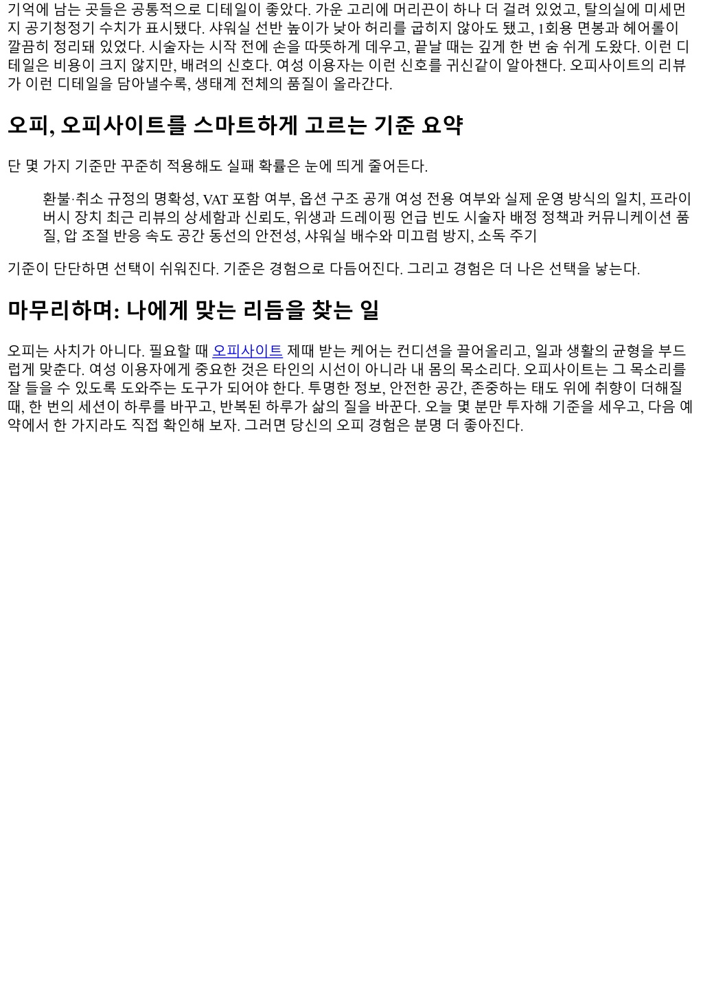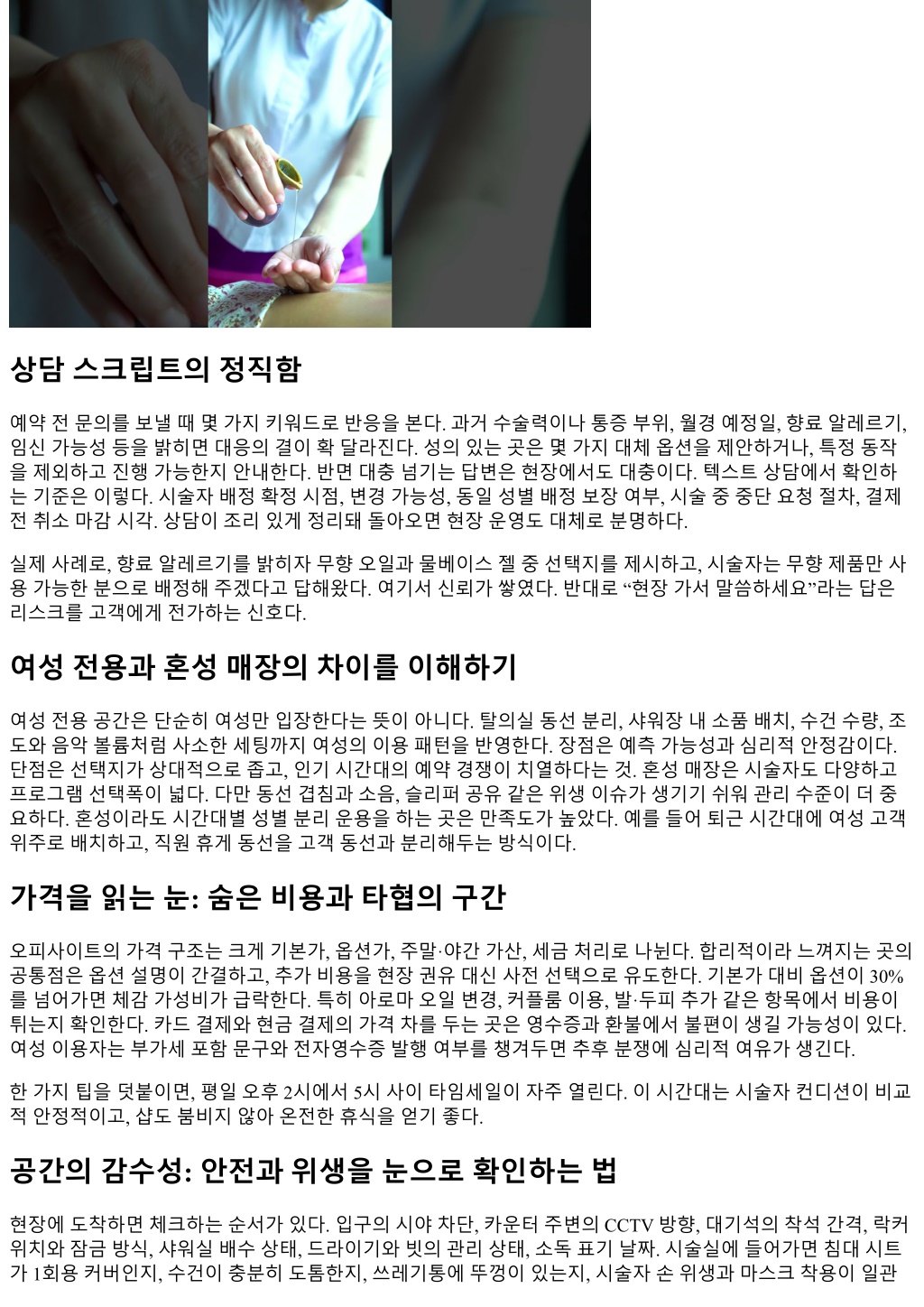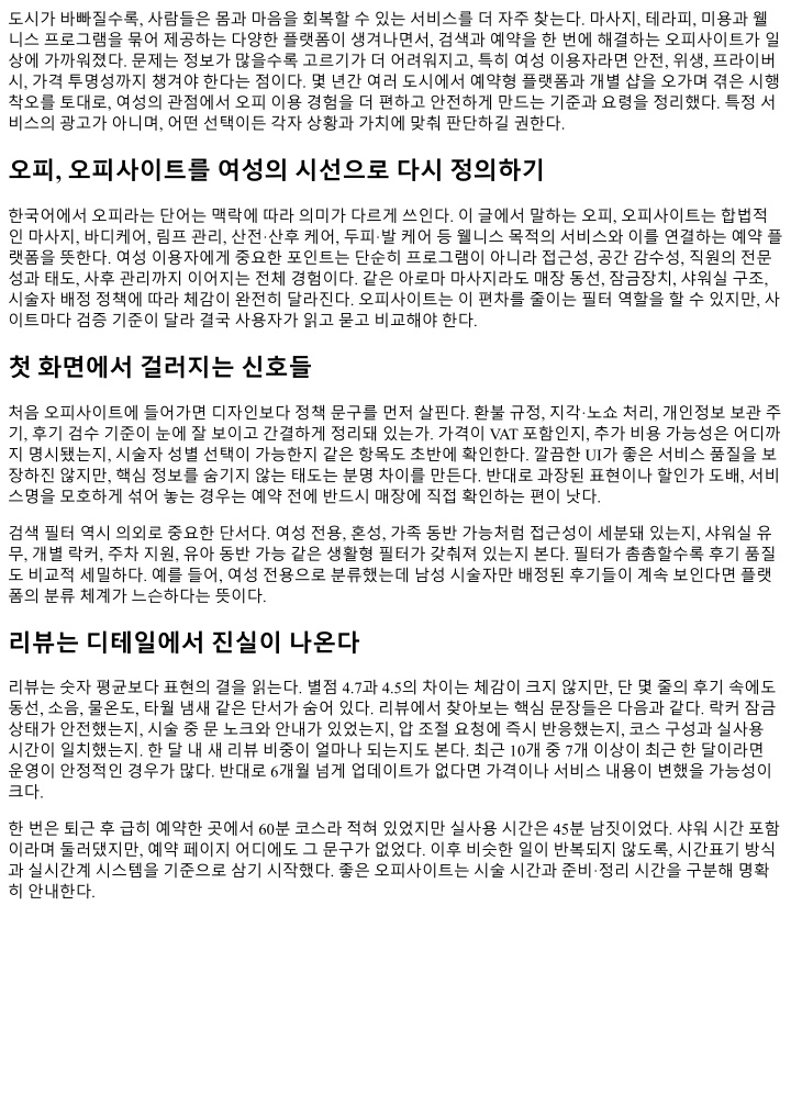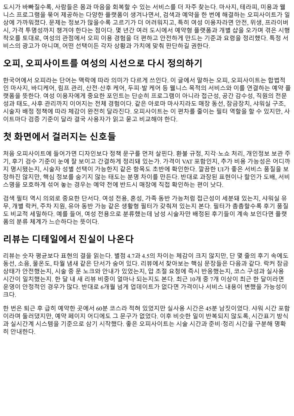 도시가바빠질수록, 사람들은몸과마음을회복할수있는서비스를더자주찾는다. 마사지, 테라피, 미용과웰 니스프로그램을묶어제공하는다양한플랫폼이생겨나면서, 검색과예약을한번에해결하는오피사이트가일 상에가까워졌다. 문제는정보가많을수록고르기가더어려워지고, 특히여성이용자라면안전, 위생, 프라이버 시, 가격투명성까지챙겨야한다는점이다. 몇년간여러도시에서예약형플랫폼과개별샵을오가며겪은시행 착오를토대로, 여성의관점에서오피이용경험을더편하고안전하게만드는기준과요령을정리했다. 특정서 비스의광고가아니며, 어떤선택이든각자상황과가치에맞춰판단하길권한다. 오피, 오피사이트를여성의시선으로다시정의하기 한국어에서오피라는단어는맥락에따라의미가다르게쓰인다. 이글에서말하는오피, 오피사이트는합법적 인마사지, 바디케어, 림프관리, 산전·산후케어, 두피·발케어등웰니스목적의서비스와이를연결하는예약플 랫폼을뜻한다. 여성이용자에게중요한포인트는단순히프로그램이아니라접근성, 공간감수성, 직원의전문 성과태도, 사후관리까지이어지는전체경험이다. 같은아로마마사지라도매장동선, 잠금장치, 샤워실구조, 시술자배정정책에따라체감이완전히달라진다. 오피사이트는이편차를줄이는필터역할을할수있지만, 사 이트마다검증기준이달라결국사용자가읽고묻고비교해야한다. 첫화면에서걸러지는신호들 처음오피사이트에들어가면디자인보다정책문구를먼저살핀다. 환불규정, 지각·노쇼처리, 개인정보보관주 기, 후기검수기준이눈에잘보이고간결하게정리돼있는가. 가격이 VAT 포함인지, 추가비용가능성은어디까 지명시됐는지, 시술자성별선택이가능한지같은항목도초반에확인한다. 깔끔한 UI가좋은서비스품질을보 장하진않지만, 핵심정보를숨기지않는태도는분명차이를만든다. 반대로과장된표현이나할인가도배, 서비 스명을모호하게섞어놓는경우는예약전에반드시매장에직접확인하는편이낫다. 검색필터역시의외로중요한단서다. 여성전용, 혼성, 가족동반가능처럼접근성이세분돼있는지, 샤워실유 무, 개별락커, 주차지원, 유아동반가능같은생활형필터가갖춰져있는지본다. 필터가촘촘할수록후기품질 도비교적세밀하다. 예를들어, 여성전용으로분류했는데남성시술자만배정된후기들이계속보인다면플랫 폼의분류체계가느슨하다는뜻이다. 리뷰는디테일에서진실이나온다 리뷰는숫자평균보다표현의결을읽는다. 별점 4.7과 4.5의차이는체감이크지않지만, 단몇줄의후기속에도 동선, 소음, 물온도, 타월냄새같은단서가숨어있다. 리뷰에서찾아보는핵심문장들은다음과같다. 락커잠금 상태가안전했는지, 시술중문노크와안내가있었는지, 압조절요청에즉시반응했는지, 코스구성과실사용 시간이일치했는지. 한달내새리뷰비중이얼마나되는지도본다. 최근 10개중 7개이상이최근한달이라면 운영이안정적인경우가많다. 반대로 6개월넘게업데이트가없다면가격이나서비스내용이변했을가능성이 크다. 한번은퇴근후급히예약한곳에서 60분코스라적혀있었지만실사용시간은 45분남짓이었다. 샤워시간포함 이라며둘러댔지만, 예약페이지어디에도그문구가없었다. 이후비슷한일이반복되지않도록, 시간표기방식 과실시간계시스템을기준으로삼기시작했다. 좋은오피사이트는시술시간과준비·정리시간을구분해명확 히안내한다.