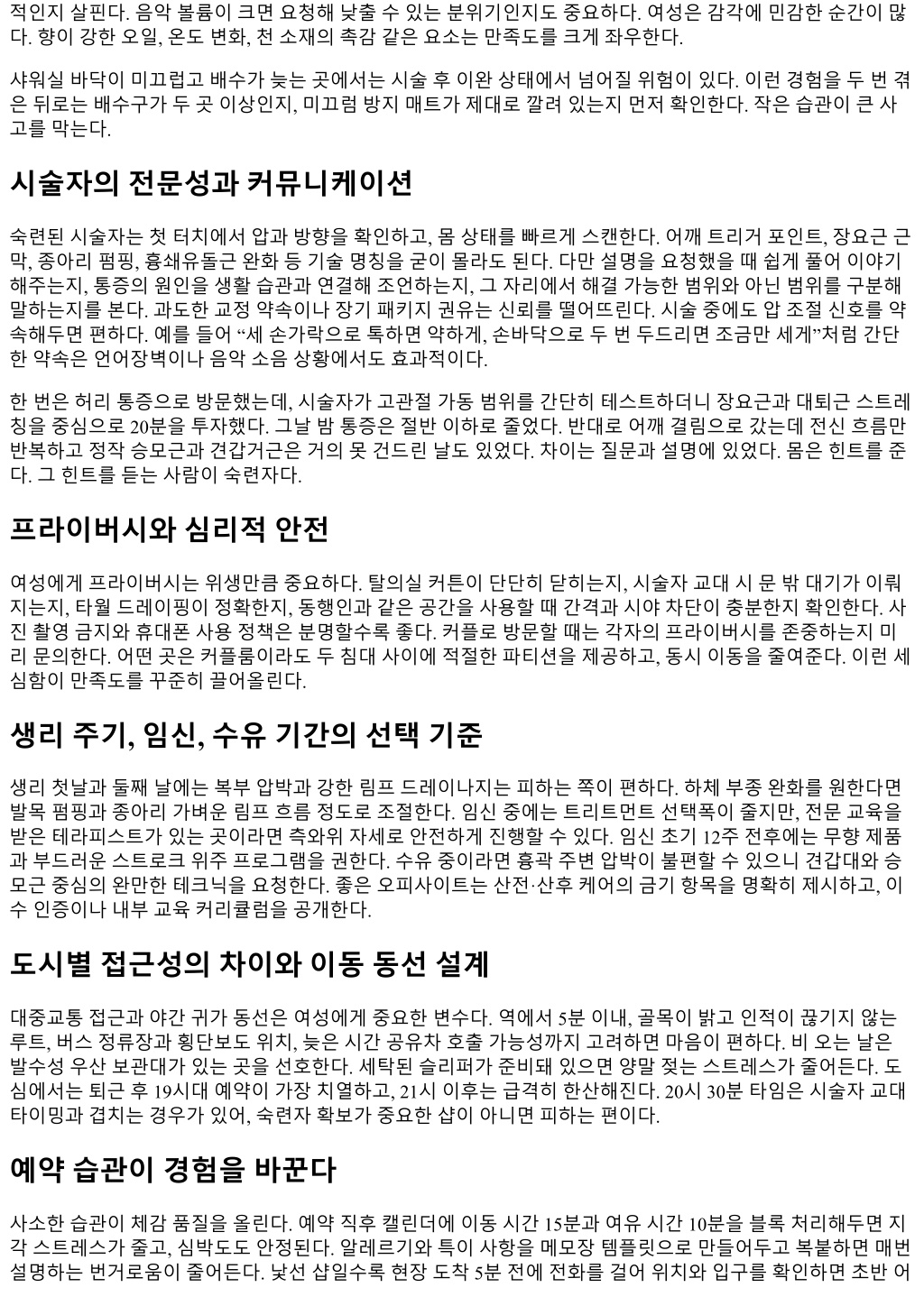 적인지살핀다. 음악볼륨이크면요청해낮출수있는분위기인지도중요하다. 여성은감각에민감한순간이많 다. 향이강한오일, 온도변화, 천소재의촉감같은요소는만족도를크게좌우한다. 샤워실바닥이미끄럽고배수가늦는곳에서는시술후이완상태에서넘어질위험이있다. 이런경험을두번겪 은뒤로는배수구가두곳이상인지, 미끄럼방지매트가제대로깔려있는지먼저확인한다. 작은습관이큰사 고를막는다. 시술자의전문성과커뮤니케이션 숙련된시술자는첫터치에서압과방향을확인하고, 몸상태를빠르게스캔한다. 어깨트리거포인트, 장요근근 막, 종아리펌핑, 흉쇄유돌근완화등기술명칭을굳이몰라도된다. 다만설명을요청했을때쉽게풀어이야기 해주는지, 통증의원인을생활습관과연결해조언하는지, 그자리에서해결가능한범위와아닌범위를구분해 말하는지를본다. 과도한교정약속이나장기패키지권유는신뢰를떨어뜨린다. 시술중에도압조절신호를약 속해두면편하다. 예를들어 “세손가락으로톡하면약하게, 손바닥으로두번두드리면조금만세게”처럼간단 한약속은언어장벽이나음악소음상황에서도효과적이다. 한번은허리통증으로방문했는데, 시술자가고관절가동범위를간단히테스트하더니장요근과대퇴근스트레 칭을중심으로 20분을투자했다. 그날밤통증은절반이하로줄었다. 반대로어깨결림으로갔는데전신흐름만 반복하고정작승모근과견갑거근은거의못건드린날도있었다. 차이는질문과설명에있었다. 몸은힌트를준 다. 그힌트를듣는사람이숙련자다. 프라이버시와심리적안전 여성에게프라이버시는위생만큼중요하다. 탈의실커튼이단단히닫히는지, 시술자교대시문밖대기가이뤄 지는지, 타월드레이핑이정확한지, 동행인과같은공간을사용할때간격과시야차단이충분한지확인한다. 사 진촬영금지와휴대폰사용정책은분명할수록좋다. 커플로방문할때는각자의프라이버시를존중하는지미 리문의한다. 어떤곳은커플룸이라도두침대사이에적절한파티션을제공하고, 동시이동을줄여준다. 이런세 심함이만족도를꾸준히끌어올린다. 생리주기, 임신, 수유기간의선택기준 생리첫날과둘째날에는복부압박과강한림프드레이나지는피하는쪽이편하다. 하체부종완화를원한다면 발목펌핑과종아리가벼운림프흐름정도로조절한다. 임신중에는트리트먼트선택폭이줄지만, 전문교육을 받은테라피스트가있는곳이라면측와위자세로안전하게진행할수있다. 임신초기 12주전후에는무향제품 과부드러운스트로크위주프로그램을권한다. 수유중이라면흉곽주변압박이불편할수있으니견갑대와승 모근중심의완만한테크닉을요청한다. 좋은오피사이트는산전·산후케어의금기항목을명확히제시하고, 이 수인증이나내부교육커리큘럼을공개한다. 도시별접근성의차이와이동동선설계 대중교통접근과야간귀가동선은여성에게중요한변수다. 역에서 5분이내, 골목이밝고인적이끊기지않는 루트, 버스정류장과횡단보도위치, 늦은시간공유차호출가능성까지고려하면마음이편하다. 비오는날은 발수성우산보관대가있는곳을선호한다. 세탁된슬리퍼가준비돼있으면양말젖는스트레스가줄어든다. 도 심에서는퇴근후 19시대예약이가장치열하고, 21시이후는급격히한산해진다. 20시 30분타임은시술자교대 타이밍과겹치는경우가있어, 숙련자확보가중요한샵이아니면피하는편이다. 예약습관이경험을바꾼다 사소한습관이체감품질을올린다. 예약직후캘린더에이동시간 15분과여유시간 10분을블록처리해두면지 각스트레스가줄고, 심박도도안정된다. 알레르기와특이사항을메모장템플릿으로만들어두고복붙하면매번 설명하는번거로움이줄어든다. 낯선샵일수록현장도착 5분전에전화를걸어위치와입구를확인하면초반어