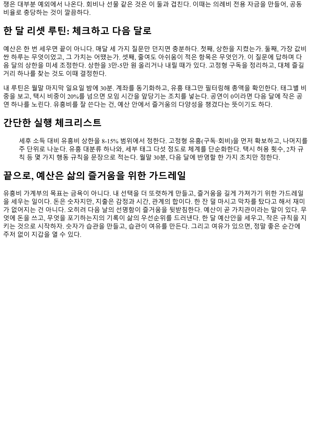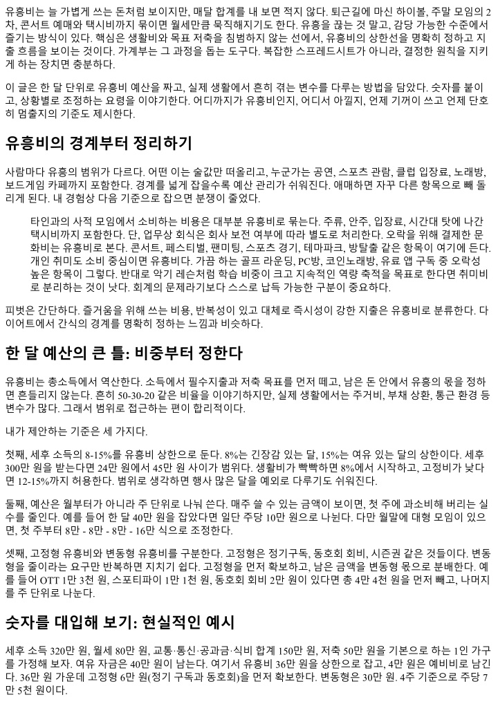 쟁은대부분예외에서나온다. 회비나선물같은것은이둘과겹친다. 이때는의례비전용자금을만들어, 공동 비율로충당하는것이깔끔하다. 한달리셋루틴: 체크하고다음달로 예산은한번세우면끝이아니다. 매달세가지질문만던지면충분하다. 첫째, 상한을지켰는가. 둘째, 가장값비 싼하루는무엇이었고, 그가치는어땠는가. 셋째, 줄여도아쉬움이적은항목은무엇인가. 이질문에답하며다 음달의상한을미세조정한다. 상한을 3만-5만원올리거나내릴때가있다. 고정형구독을정리하고, 대체즐길 거리하나를찾는것도이때결정한다. 내루틴은월말마지막일요일밤에 30분. 계좌를동기화하고, 유흥태그만필터링해총액을확인한다. 태그별비 중을보고, 택시비중이 20%를넘으면모임시간을앞당기는조치를넣는다. 공연이 0이라면다음달에작은공 연하나를노린다. 유흥비를잘쓴다는건, 예산안에서즐거움의다양성을챙겼다는뜻이기도하다. 간단한실행체크리스트 세후소득대비유흥비상한을 8-15% 범위에서정한다. 고정형유흥(구독·회비)을먼저확보하고, 나머지를 주단위로나눈다. 유흥대분류하나와, 세부태그다섯정도로체계를단순화한다. 택시허용횟수, 2차규 칙등몇가지행동규칙을문장으로적는다. 월말 30분, 다음달에반영할한가지조치만정한다. 끝으로, 예산은삶의즐거움을위한가드레일 유흥비가계부의목표는금욕이아니다. 내선택을더또렷하게만들고, 즐거움을길게가져가기위한가드레일 을세우는일이다. 돈은숫자지만, 지출은감정과시간, 관계의합이다. 한잔덜마시고막차를탔다고해서재미 가없어지는건아니다. 오히려다음날의선명함이즐거움을뒷받침한다. 예산이곧가치관이라는말이있다. 무 엇에돈을쓰고, 무엇을포기하는지의기록이삶의우선순위를드러낸다. 한달예산안을세우고, 작은규칙을지 키는것으로시작하자. 숫자가습관을만들고, 습관이여유를만든다. 그리고여유가있으면, 정말좋은순간에 주저없이지갑을열수있다.