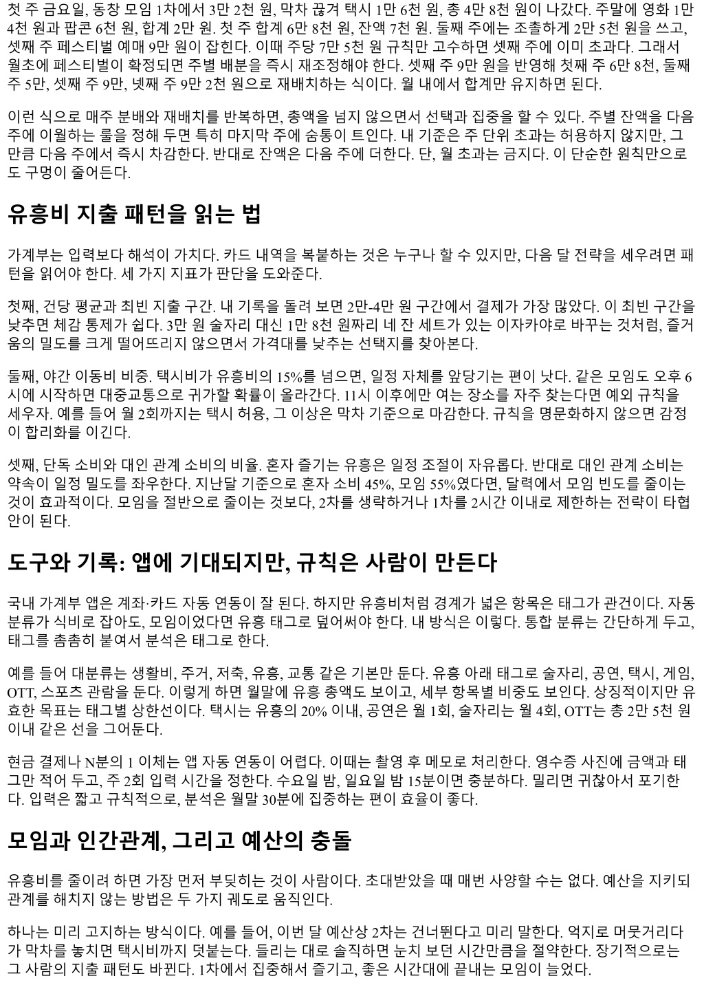 첫주금요일, 동창모임 1차에서 3만 2천원, 막차끊겨택시 1만 6천원, 총 4만 8천원이나갔다. 주말에영화 1만 4천원과팝콘 6천원, 합계 2만원. 첫주합계 6만 8천원, 잔액 7천원. 둘째주에는조촐하게 2만 5천원을쓰고, 셋째주페스티벌예매 9만원이잡힌다. 이때주당 7만 5천원규칙만고수하면셋째주에이미초과다. 그래서 월초에페스티벌이확정되면주별배분을즉시재조정해야한다. 셋째주 9만원을반영해첫째주 6만 8천, 둘째 주 5만, 셋째주 9만, 넷째주 9만 2천원으로재배치하는식이다. 월내에서합계만유지하면된다. 이런식으로매주분배와재배치를반복하면, 총액을넘지않으면서선택과집중을할수있다. 주별잔액을다음 주에이월하는룰을정해두면특히마지막주에숨통이트인다. 내기준은주단위초과는허용하지않지만, 그 만큼다음주에서즉시차감한다. 반대로잔액은다음주에더한다. 단, 월초과는금지다. 이단순한원칙만으로 도구멍이줄어든다. 유흥비지출패턴을읽는법 가계부는입력보다해석이가치다. 카드내역을복붙하는것은누구나할수있지만, 다음달전략을세우려면패 턴을읽어야한다. 세가지지표가판단을도와준다. 첫째, 건당평균과최빈지출구간. 내기록을돌려보면 2만-4만원구간에서결제가가장많았다. 이최빈구간을 낮추면체감통제가쉽다. 3만원술자리대신 1만 8천원짜리네잔세트가있는이자카야로바꾸는것처럼, 즐거 움의밀도를크게떨어뜨리지않으면서가격대를낮추는선택지를찾아본다. 둘째, 야간이동비비중. 택시비가유흥비의 15%를넘으면, 일정자체를앞당기는편이낫다. 같은모임도오후 6 시에시작하면대중교통으로귀가할확률이올라간다. 11시이후에만여는장소를자주찾는다면예외규칙을 세우자. 예를들어월 2회까지는택시허용, 그이상은막차기준으로마감한다. 규칙을명문화하지않으면감정 이합리화를이긴다. 셋째, 단독소비와대인관계소비의비율. 혼자즐기는유흥은일정조절이자유롭다. 반대로대인관계소비는 약속이일정밀도를좌우한다. 지난달기준으로혼자소비 45%, 모임 55%였다면, 달력에서모임빈도를줄이는 것이효과적이다. 모임을절반으로줄이는것보다, 2차를생략하거나 1차를 2시간이내로제한하는전략이타협 안이된다. 도구와기록: 앱에기대되지만, 규칙은사람이만든다 국내가계부앱은계좌·카드자동연동이잘된다. 하지만유흥비처럼경계가넓은항목은태그가관건이다. 자동 분류가식비로잡아도, 모임이었다면유흥태그로덮어써야한다. 내방식은이렇다. 통합분류는간단하게두고, 태그를촘촘히붙여서분석은태그로한다. 예를들어대분류는생활비, 주거, 저축, 유흥, 교통같은기본만둔다. 유흥아래태그로술자리, 공연, 택시, 게임, OTT, 스포츠관람을둔다. 이렇게하면월말에유흥총액도보이고, 세부항목별비중도보인다. 상징적이지만유 효한목표는태그별상한선이다. 택시는유흥의 20% 이내, 공연은월 1회, 술자리는월 4회, OTT는총 2만 5천원 이내같은선을그어둔다. 현금결제나 N분의 1 이체는앱자동연동이어렵다. 이때는촬영후메모로처리한다. 영수증사진에금액과태 그만적어두고, 주 2회입력시간을정한다. 수요일밤, 일요일밤 15분이면충분하다. 밀리면귀찮아서포기한 다. 입력은짧고규칙적으로, 분석은월말 30분에집중하는편이효율이좋다. 모임과인간관계, 그리고예산의충돌 유흥비를줄이려하면가장먼저부딪히는것이사람이다. 초대받았을때매번사양할수는없다. 예산을지키되 관계를해치지않는방법은두가지궤도로움직인다. 하나는미리고지하는방식이다. 예를들어, 이번달예산상 2차는건너뛴다고미리말한다. 억지로머뭇거리다 가막차를놓치면택시비까지덧붙는다. 들리는대로솔직하면눈치보던시간만큼을절약한다. 장기적으로는 그사람의지출패턴도바뀐다. 1차에서집중해서즐기고, 좋은시간대에끝내는모임이늘었다.