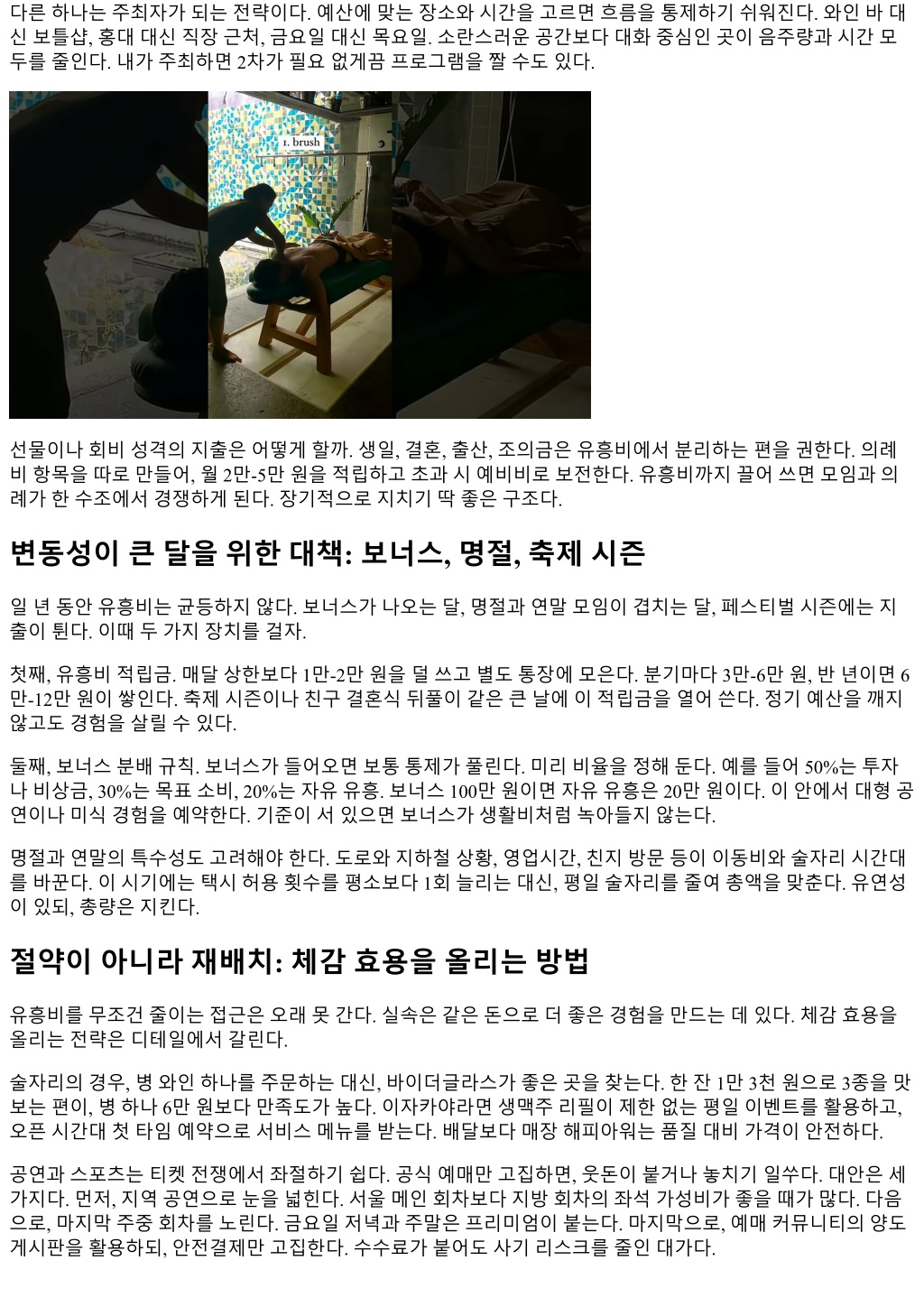 다른하나는주최자가되는전략이다. 예산에맞는장소와시간을고르면흐름을통제하기쉬워진다. 와인바대 신보틀샵, 홍대대신직장근처, 금요일대신목요일. 소란스러운공간보다대화중심인곳이음주량과시간모 두를줄인다. 내가주최하면 2차가필요없게끔프로그램을짤수도있다. 선물이나회비성격의지출은어떻게할까. 생일, 결혼, 출산, 조의금은유흥비에서분리하는편을권한다. 의례 비항목을따로만들어, 월 2만-5만원을적립하고초과시예비비로보전한다. 유흥비까지끌어쓰면모임과의 례가한수조에서경쟁하게된다. 장기적으로지치기딱좋은구조다. 변동성이큰달을위한대책: 보너스, 명절, 축제시즌 일년동안유흥비는균등하지않다. 보너스가나오는달, 명절과연말모임이겹치는달, 페스티벌시즌에는지 출이튄다. 이때두가지장치를걸자. 첫째, 유흥비적립금. 매달상한보다 1만-2만원을덜쓰고별도통장에모은다. 분기마다 3만-6만원, 반년이면 6 만-12만원이쌓인다. 축제시즌이나친구결혼식뒤풀이같은큰날에이적립금을열어쓴다. 정기예산을깨지 않고도경험을살릴수있다. 둘째, 보너스분배규칙. 보너스가들어오면보통통제가풀린다. 미리비율을정해둔다. 예를들어 50%는투자 나비상금, 30%는목표소비, 20%는자유유흥. 보너스 100만원이면자유유흥은 20만원이다. 이안에서대형공 연이나미식경험을예약한다. 기준이서있으면보너스가생활비처럼녹아들지않는다. 명절과연말의특수성도고려해야한다. 도로와지하철상황, 영업시간, 친지방문등이이동비와술자리시간대 를바꾼다. 이시기에는택시허용횟수를평소보다 1회늘리는대신, 평일술자리를줄여총액을맞춘다. 유연성 이있되, 총량은지킨다. 절약이아니라재배치: 체감효용을올리는방법 유흥비를무조건줄이는접근은오래못간다. 실속은같은돈으로더좋은경험을만드는데있다. 체감효용을 올리는전략은디테일에서갈린다. 술자리의경우, 병와인하나를주문하는대신, 바이더글라스가좋은곳을찾는다. 한잔 1만 3천원으로 3종을맛 보는편이, 병하나 6만원보다만족도가높다. 이자카야라면생맥주리필이제한없는평일이벤트를활용하고, 오픈시간대첫타임예약으로서비스메뉴를받는다. 배달보다매장해피아워는품질대비가격이안전하다. 공연과스포츠는티켓전쟁에서좌절하기쉽다. 공식예매만고집하면, 웃돈이붙거나놓치기일쑤다. 대안은세 가지다. 먼저, 지역공연으로눈을넓힌다. 서울메인회차보다지방회차의좌석가성비가좋을때가많다. 다음 으로, 마지막주중회차를노린다. 금요일저녁과주말은프리미엄이붙는다. 마지막으로, 예매커뮤니티의양도 게시판을활용하되, 안전결제만고집한다. 수수료가붙어도사기리스크를줄인대가다.