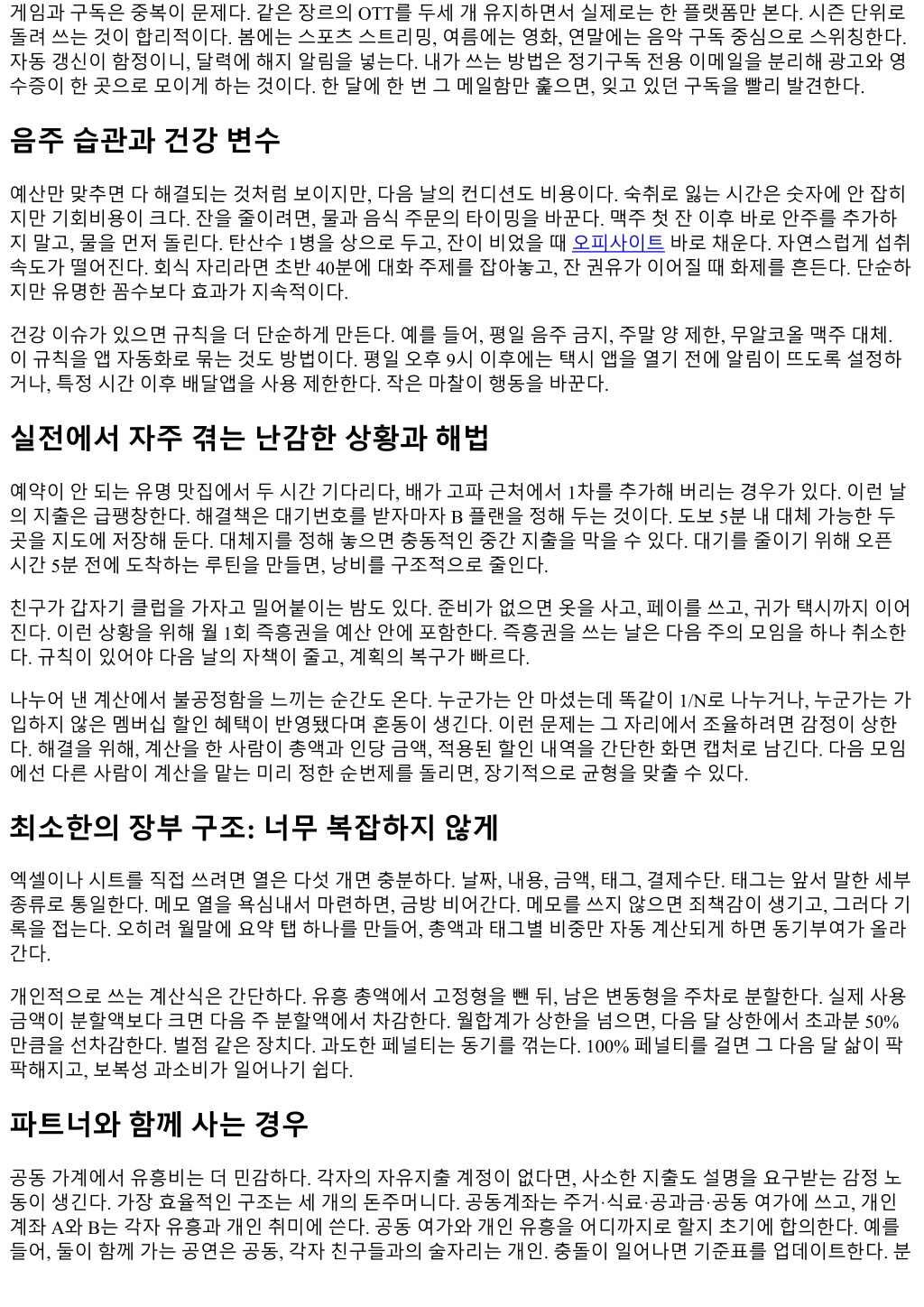 게임과구독은중복이문제다. 같은장르의 OTT를두세개유지하면서실제로는한플랫폼만본다. 시즌단위로 돌려쓰는것이합리적이다. 봄에는스포츠스트리밍, 여름에는영화, 연말에는음악구독중심으로스위칭한다. 자동갱신이함정이니, 달력에해지알림을넣는다. 내가쓰는방법은정기구독전용이메일을분리해광고와영 수증이한곳으로모이게하는것이다. 한달에한번그메일함만훑으면, 잊고있던구독을빨리발견한다. 음주습관과건강변수 예산만맞추면다해결되는것처럼보이지만, 다음날의컨디션도비용이다. 숙취로잃는시간은숫자에안잡히 지만기회비용이크다. 잔을줄이려면, 물과음식주문의타이밍을바꾼다. 맥주첫잔이후바로안주를추가하 지말고, 물을먼저돌린다. 탄산수 1병을상으로두고, 잔이비었을때오피사이트바로채운다. 자연스럽게섭취 속도가떨어진다. 회식자리라면초반 40분에대화주제를잡아놓고, 잔권유가이어질때화제를흔든다. 단순하 지만유명한꼼수보다효과가지속적이다. 건강이슈가있으면규칙을더단순하게만든다. 예를들어, 평일음주금지, 주말양제한, 무알코올맥주대체. 이규칙을앱자동화로묶는것도방법이다. 평일오후 9시이후에는택시앱을열기전에알림이뜨도록설정하 거나, 특정시간이후배달앱을사용제한한다. 작은마찰이행동을바꾼다. 실전에서자주겪는난감한상황과해법 예약이안되는유명맛집에서두시간기다리다, 배가고파근처에서 1차를추가해버리는경우가있다. 이런날 의지출은급팽창한다. 해결책은대기번호를받자마자 B 플랜을정해두는것이다. 도보 5분내대체가능한두 곳을지도에저장해둔다. 대체지를정해놓으면충동적인중간지출을막을수있다. 대기를줄이기위해오픈 시간 5분전에도착하는루틴을만들면, 낭비를구조적으로줄인다. 친구가갑자기클럽을가자고밀어붙이는밤도있다. 준비가없으면옷을사고, 페이를쓰고, 귀가택시까지이어 진다. 이런상황을위해월 1회즉흥권을예산안에포함한다. 즉흥권을쓰는날은다음주의모임을하나취소한 다. 규칙이있어야다음날의자책이줄고, 계획의복구가빠르다. 나누어낸계산에서불공정함을느끼는순간도온다. 누군가는안마셨는데똑같이 1/N로나누거나, 누군가는가 입하지않은멤버십할인혜택이반영됐다며혼동이생긴다. 이런문제는그자리에서조율하려면감정이상한 다. 해결을위해, 계산을한사람이총액과인당금액, 적용된할인내역을간단한화면캡처로남긴다. 다음모임 에선다른사람이계산을맡는미리정한순번제를돌리면, 장기적으로균형을맞출수있다. 최소한의장부구조: 너무복잡하지않게 엑셀이나시트를직접쓰려면열은다섯개면충분하다. 날짜, 내용, 금액, 태그, 결제수단. 태그는앞서말한세부 종류로통일한다. 메모열을욕심내서마련하면, 금방비어간다. 메모를쓰지않으면죄책감이생기고, 그러다기 록을접는다. 오히려월말에요약탭하나를만들어, 총액과태그별비중만자동계산되게하면동기부여가올라 간다. 개인적으로쓰는계산식은간단하다. 유흥총액에서고정형을뺀뒤, 남은변동형을주차로분할한다. 실제사용 금액이분할액보다크면다음주분할액에서차감한다. 월합계가상한을넘으면, 다음달상한에서초과분 50% 만큼을선차감한다. 벌점같은장치다. 과도한페널티는동기를꺾는다. 100% 페널티를걸면그다음달삶이팍 팍해지고, 보복성과소비가일어나기쉽다. 파트너와함께사는경우 공동가계에서유흥비는더민감하다. 각자의자유지출계정이없다면, 사소한지출도설명을요구받는감정노 동이생긴다. 가장효율적인구조는세개의돈주머니다. 공동계좌는주거·식료·공과금·공동여가에쓰고, 개인 계좌 A와 B는각자유흥과개인취미에쓴다. 공동여가와개인유흥을어디까지로할지초기에합의한다. 예를 들어, 둘이함께가는공연은공동, 각자친구들과의술자리는개인. 충돌이일어나면기준표를업데이트한다. 분