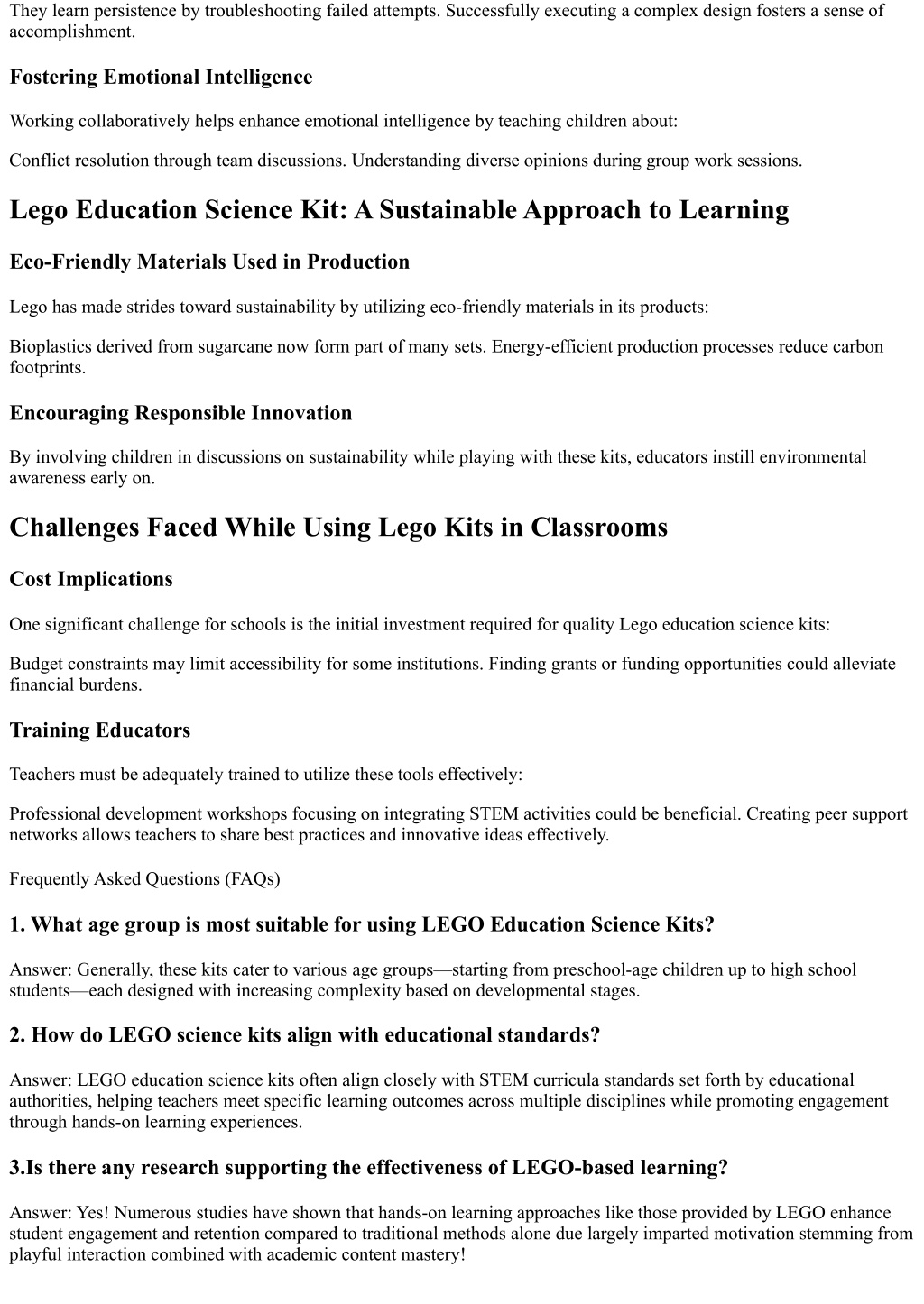 They learn persistence by troubleshooting failed attempts. Successfully executing a complex design fosters a sense of accomplishment. Fostering Emotional Intelligence Working collaboratively helps enhance emotional intelligence by teaching children about: Conflict resolution through team discussions. Understanding diverse opinions during group work sessions. Lego Education Science Kit: A Sustainable Approach to Learning Eco-Friendly Materials Used in Production Lego has made strides toward sustainability by utilizing eco-friendly materials in its products: Bioplastics derived from sugarcane now form part of many sets. Energy-efficient production processes reduce carbon footprints. Encouraging Responsible Innovation By involving children in discussions on sustainability while playing with these kits, educators instill environmental awareness early on. Challenges Faced While Using Lego Kits in Classrooms Cost Implications One significant challenge for schools is the initial investment required for quality Lego education science kits: Budget constraints may limit accessibility for some institutions. Finding grants or funding opportunities could alleviate financial burdens. Training Educators Teachers must be adequately trained to utilize these tools effectively: Professional development workshops focusing on integrating STEM activities could be beneficial. Creating peer support networks allows teachers to share best practices and innovative ideas effectively. Frequently Asked Questions (FAQs) 1. What age group is most suitable for using LEGO Education Science Kits? Answer: Generally, these kits cater to various age groups—starting from preschool-age children up to high school students—each designed with increasing complexity based on developmental stages. 2. How do LEGO science kits align with educational standards? Answer: LEGO education science kits often align closely with STEM curricula standards set forth by educational authorities, helping teachers meet specific learning outcomes across multiple disciplines while promoting engagement through hands-on learning experiences. 3.Is there any research supporting the effectiveness of LEGO-based learning? Answer: Yes! Numerous studies have shown that hands-on learning approaches like those provided by LEGO enhance student engagement and retention compared to traditional methods alone due largely imparted motivation stemming from playful interaction combined with academic content mastery!