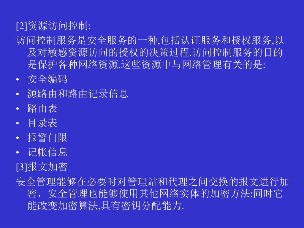 [2]资源访问控制: 访问控制服务是安全服务的一种,包括认证服务和授权服务,以及对敏感资源访问的授权的决策过程.访问控制服务的目的是保护各种网络资源,这些资源中与网络管理有关的是: • 安全编码 • 源路由和路由记录信息 • 路由表 • 目录表 • 报警门限 • 记帐信息 [3]报文加密 安全管理能够在必要时对管理站和代理之间交换的报文进行加密,安全管理也能够使用其他网络实体的加密方法;同时它能改变加密算法,具有密钥分配能力.