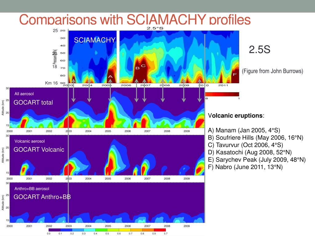 Comparisons with SCIAMACHY profiles 25 SCIAMACHY 2.5S 20 18 (Figure from John Burrows) Km 16 GOCART total Volcanic eruptions: A) Manam (Jan 2005, 4°S) B) Soufriere Hills (May 2006, 16°N) C) Tavurvur (Oct 2006, 4°S) D) Kasatochi (Aug 2008, 52°N) E) Sarychev Peak (July 2009, 48°N) F) Nabro (June 2011, 13°N) GOCART Volcanic GOCART Anthro+BB