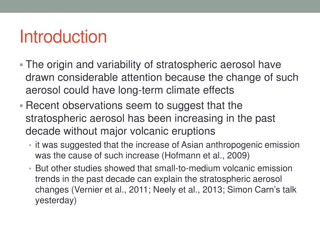 Introduction • The origin and variability of stratospheric aerosol have drawn considerable attention because the change of such aerosol could have long-term climate effects • Recent observations seem to suggest that the stratospheric aerosol has been increasing in the past decade without major volcanic eruptions • it was suggested that the increase of Asian anthropogenic emission was the cause of such increase (Hofmann et al., 2009) • But other studies showed that small-to-medium volcanic emission trends in the past decade can explain the stratospheric aerosol changes (Vernier et al., 2011; Neely et al., 2013; Simon Carn’s talk yesterday)