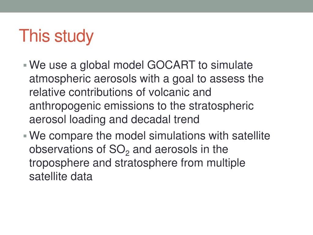 This study • We use a global model GOCART to simulate atmospheric aerosols with a goal to assess the relative contributions of volcanic and anthropogenic emissions to the stratospheric aerosol loading and decadal trend • We compare the model simulations with satellite observations of SO2 and aerosols in the troposphere and stratosphere from multiple satellite data