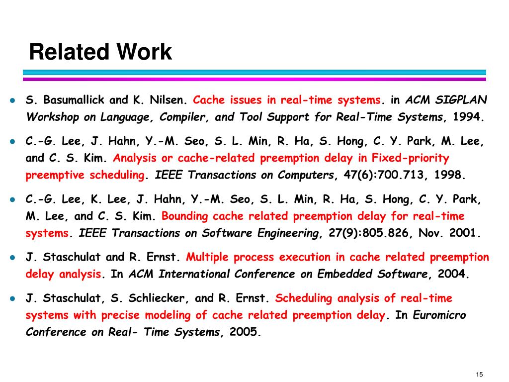 Related Work • S. Basumallick and K. Nilsen. Cache issues in real-time systems. in ACM SIGPLAN Workshop on Language, Compiler, and Tool Support for Real-Time Systems, 1994. • C.-G. Lee, J. Hahn, Y.-M. Seo, S. L. Min, R. Ha, S. Hong, C. Y. Park, M. Lee, and C. S. Kim. Analysis or cache-related preemption delay in Fixed-priority preemptive scheduling. IEEE Transactions on Computers, 47(6):700.713, 1998. • C.-G. Lee, K. Lee, J. Hahn, Y.-M. Seo, S. L. Min, R. Ha, S. Hong, C. Y. Park, M. Lee, and C. S. Kim. Bounding cache related preemption delay for real-time systems. IEEE Transactions on Software Engineering, 27(9):805.826, Nov. 2001. • J. Staschulat and R. Ernst. Multiple process execution in cache related preemption delay analysis. In ACM International Conference on Embedded Software, 2004. • J. Staschulat, S. Schliecker, and R. Ernst. Scheduling analysis of real-time systems with precise modeling of cache related preemption delay. In Euromicro Conference on Real- Time Systems, 2005.