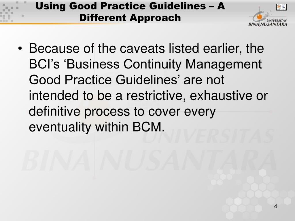 Using Good Practice Guidelines – A Different Approach • Because of the caveats listed earlier, the BCI’s ‘Business Continuity Management Good Practice Guidelines’ are not intended to be a restrictive, exhaustive or definitive process to cover every eventuality within BCM.