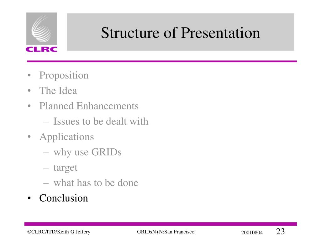 Structure of Presentation • Proposition • The Idea • Planned Enhancements • Issues to be dealt with • Applications • why use GRIDs • target • what has to be done • Conclusion