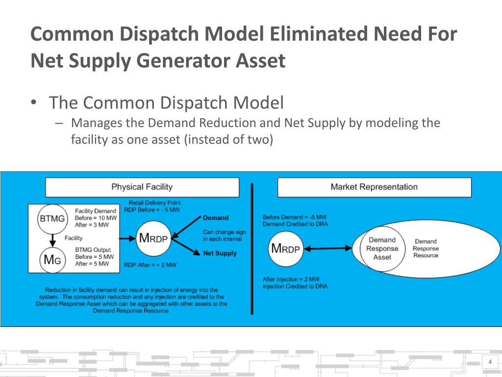 Common Dispatch Model Eliminated Need For Net Supply Generator Asset • The Common Dispatch Model • Manages the Demand Reduction and Net Supply by modeling the facility as one asset (instead of two)