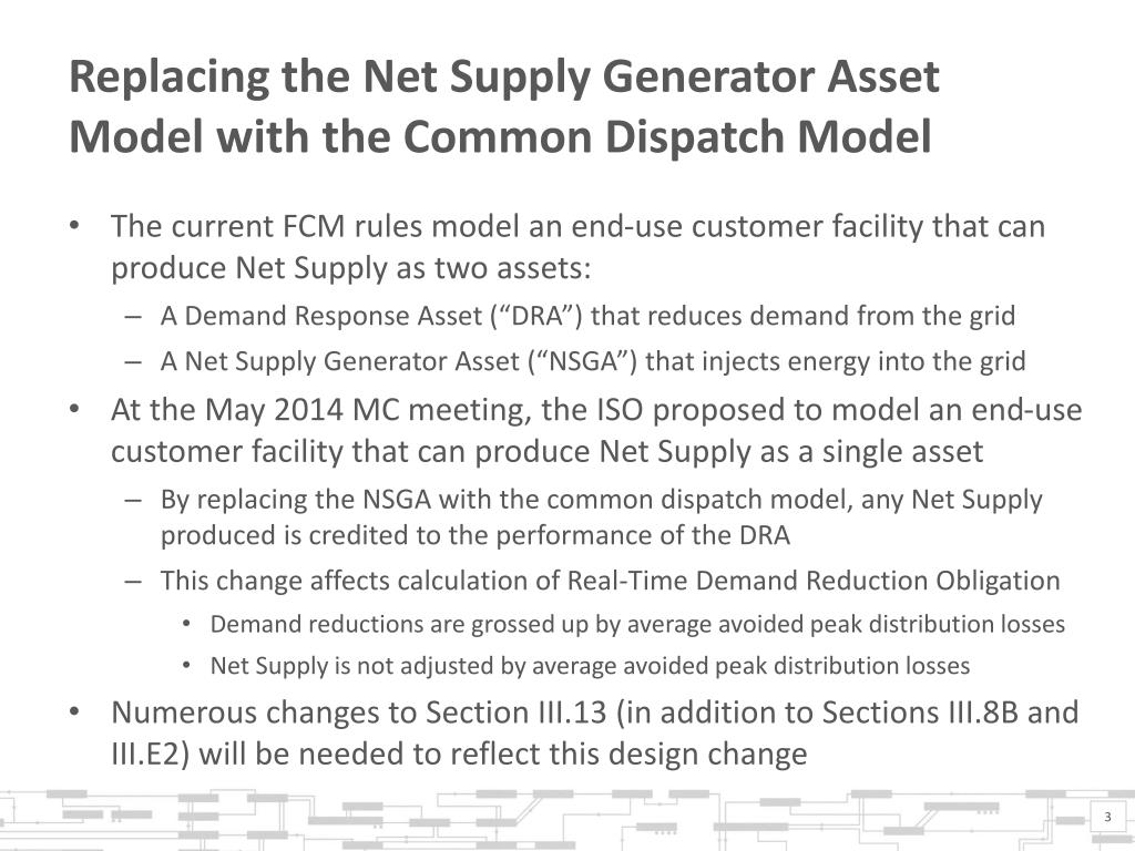 Replacing the Net Supply Generator Asset Model with the Common Dispatch Model • The current FCM rules model an end-use customer facility that can produce Net Supply as two assets: • A Demand Response Asset (“DRA”) that reduces demand from the grid • A Net Supply Generator Asset (“NSGA”) that injects energy into the grid • At the May 2014 MC meeting, the ISO proposed to model an end-use customer facility that can produce Net Supply as a single asset • By replacing the NSGA with the common dispatch model, any Net Supply produced is credited to the performance of the DRA • This change affects calculation of Real-Time Demand Reduction Obligation • Demand reductions are grossed up by average avoided peak distribution losses • Net Supply is not adjusted by average avoided peak distribution losses • Numerous changes to Section III.13 (in addition to Sections III.8B and III.E2) will be needed to reflect this design change