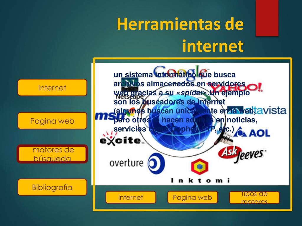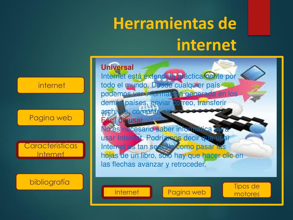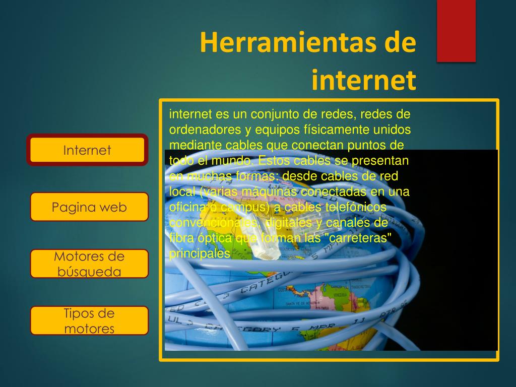 Herramientas de internet internet es un conjunto de redes, redes de ordenadores y equipos físicamente unidos mediante cables que conectan puntos de todo el mundo. Estos cables se presentan en muchas formas: desde cables de red local (varias máquinas conectadas en una oficina o campus) a cables telefónicos convencionales, digitales y canales de fibra óptica que forman las "carreteras" principales Internet Pagina web Motores de búsqueda Tipos de motores