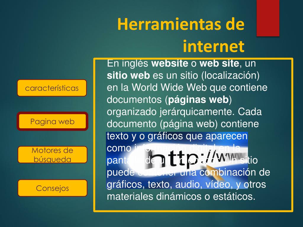 Herramientas de internet • En inglés website o web site, un sitio web es un sitio (localización) en la World Wide Web que contiene documentos (páginas web) organizado jerárquicamente. Cada documento (página web) contiene texto y o gráficos que aparecen como información digital en la pantalla de un ordenador. Un sitio puede contener una combinación de gráficos, texto, audio, vídeo, y otros materiales dinámicos o estáticos. características Pagina web Motores de búsqueda Consejos