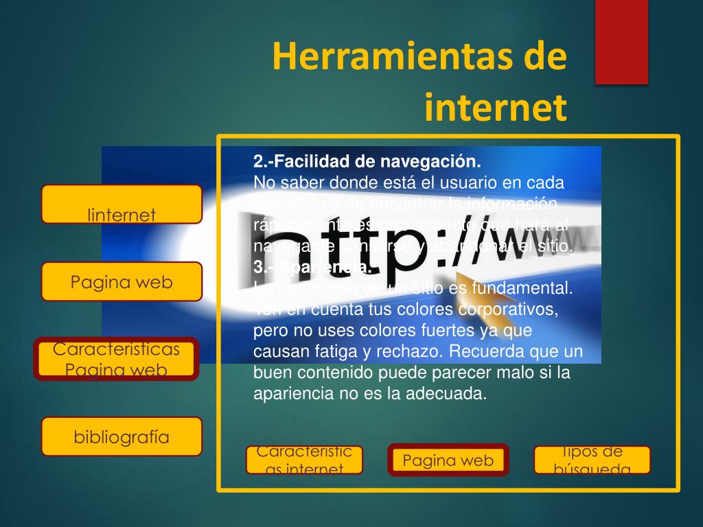 Herramientas de internet 2.-Facilidad de navegación.No saber donde está el usuario en cada momento y no encontrar la información rápidamente es otro aspecto que hará al navegante cansarse y abandonar el sitio. 3.- Apariencia.La apariencia de un sitio es fundamental. Ten en cuenta tus colores corporativos, pero no uses colores fuertes ya que causan fatiga y rechazo. Recuerda que un buen contenido puede parecer malo si la apariencia no es la adecuada. Iinternet Pagina web Características Pagina web bibliografía Características internet Pagina web Tipos de búsqueda