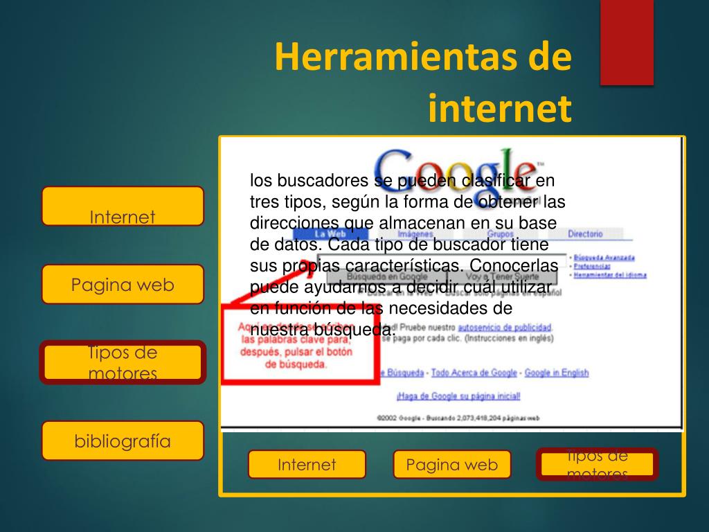 Herramientas de internet los buscadores se pueden clasificar en tres tipos, según la forma de obtener las direcciones que almacenan en su base de datos. Cada tipo de buscador tiene sus propias características. Conocerlas puede ayudarnos a decidir cuál utilizar en función de las necesidades de nuestra búsqueda. Internet Pagina web Tipos de motores bibliografía Internet Pagina web Tipos de motores